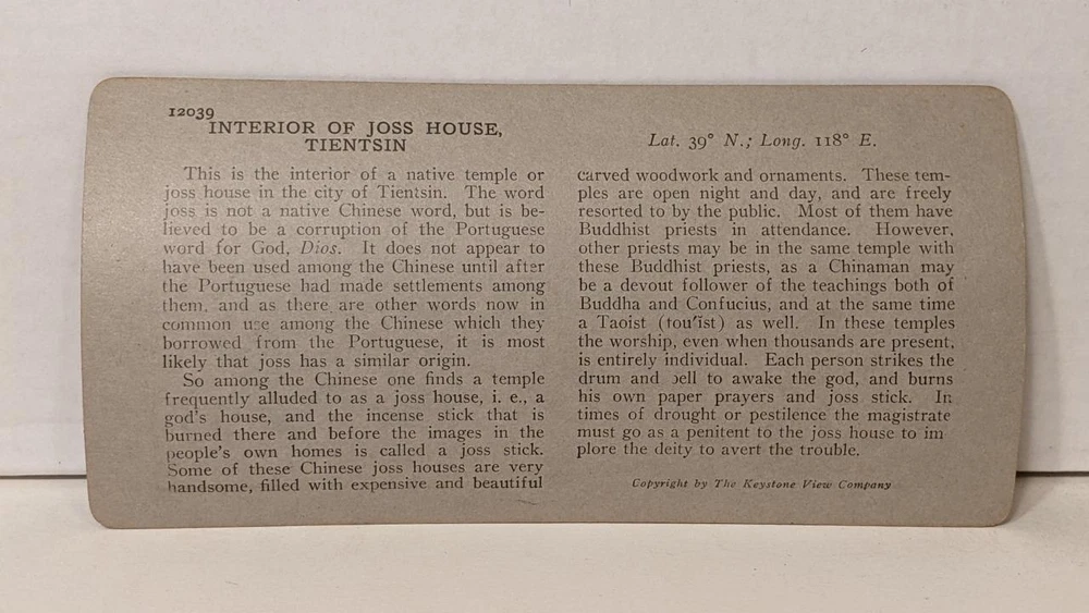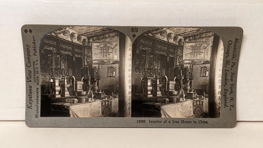 a500, Keystone SV; Interior of a Joss House in China; 976-12039, 1930 a500, Keystone SV; Interior of a Joss House in China; 976-12039, 1930 Click images to enlarge Description You are bidding on an original Stereoview/Stereograph SV card, titled: "Interior of a Joss House in Tientsin, China"; 1930s, card #976-12039. (part of Tour of the World set - TOTW). To see all of my "Stereoview Cards" click here . To see all of my historical "Cabinet Cards" click here . More Info on this Card: This Stereoview Card is part of a 1200 (Reg #'s) card set visiting all of the important countries of the World. Preface to the Tour of the World book: Special preparation for this World Tour has been made by Keystone View Company. Scores of land photographers have been sent to all parts of the world, and airplane photographers have been sent into the air to secure stereoscopic photographs from which a choice selection has been made for this wonderful journey. Size: 3.5" by 7" Subjects: Architecture, Building, Interior, Tianjin, Temple, Incense Stick, Carved Ornaments Photographer/Publisher: Keystone View Co. Date: circa 1930s More Stereoview Info: Stereoscopy or Stereoviews have two nearly identical images mounted side by side and were taken by a Stereo Camera. When looked at through a stereo viewer they give a three-dimensional image. Most popular from 1850’s to 1930’s and they usually measure about 3 ½" by 7" (please see images). This SV card is part of a very large collection (over 5000) I will be auctioning on Ebay over the next 6-8 months. Some of the subjects will be: Alaska, Austria, Boston, California, Celebrities, Chicago, Colorado, Comedy, Cuba, Egypt, Florida, Industry, Ireland, Italy, Japan, London, New Hampshire, New Jersey, New York City, Niagara Falls, Paris, Pennsylvania, People, Philadelphia, Pittsburgh, Rome, San Francisco, Scotland, St. Louis, Tragedies, Virginia, Volcano's, Washington DC, Wisconsin, Yellowstone and Yosemite. Card Condition: VG/EX-EX (some edge & corner wear). (please see the images) This Stereoview would make a great addition to your collection or as a Gift . Visit My eBay Store Please checkout my newest Collections with FREE S&H Please checkout my 1880's Baseball Victorian Trade cards in my Ebay Store Please checkout my 1870's Baseball Tintypes in my Ebay Store Please checkout my Movie Glass Slides in my Ebay Store Please checkout my NASA Items in my Ebay Store To see all my Postcards To see all my Movie Items To see all my Disney Items To see all my Baseball Items To see all my Boy Scout Cards To see all my Stereoview Cards Add me to your Favorite Sellers and Sign up for my Newsletter This Item will be shipped securely. I will combine lots to save on the shipping costs and I use USPS Ground Advantage (the old 1st class) shipping (it gives both of us tracking of the package). Please look at my other Auctions for more Collectibles of the 1800's-1900's. Pictures sell! Auctiva offers Free Image Hosting and Editing. 300+ Listing Templates! Auctiva gets you noticed! The complete eBay Selling Solution. Track Page Views With Auctiva's Counter