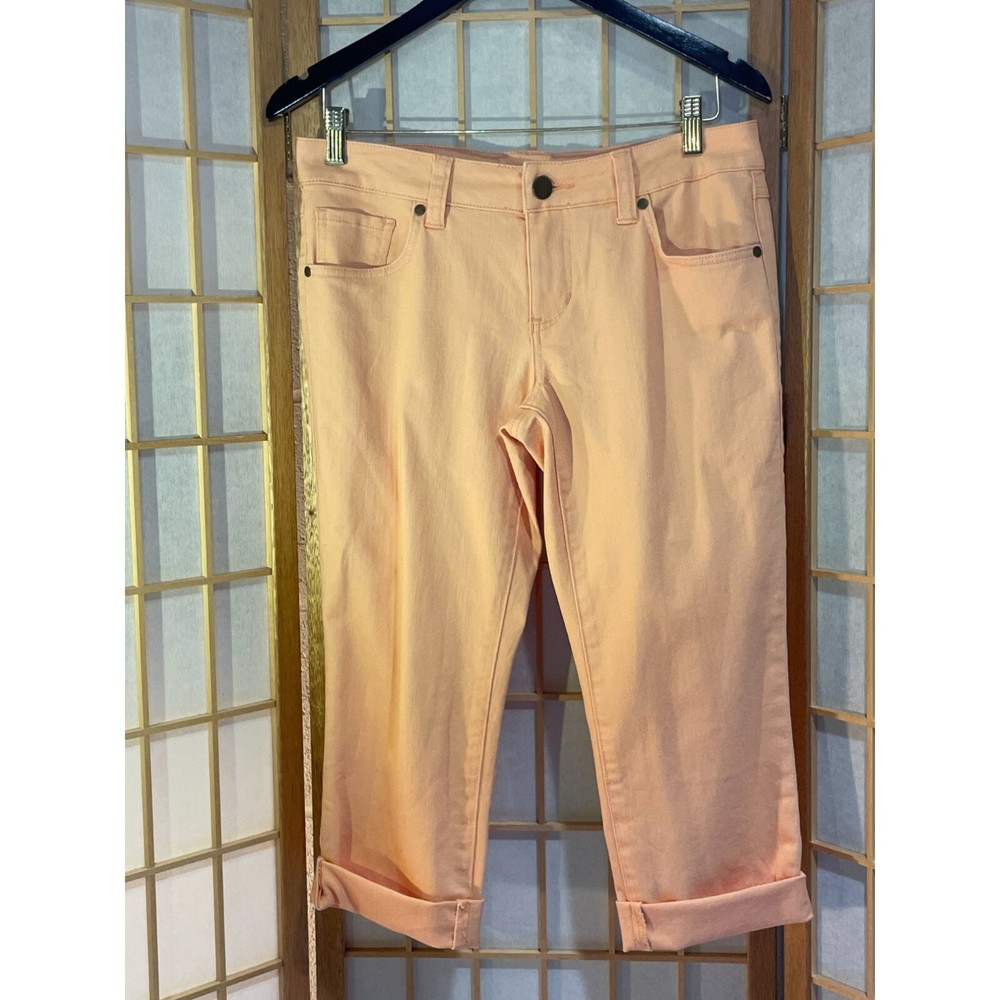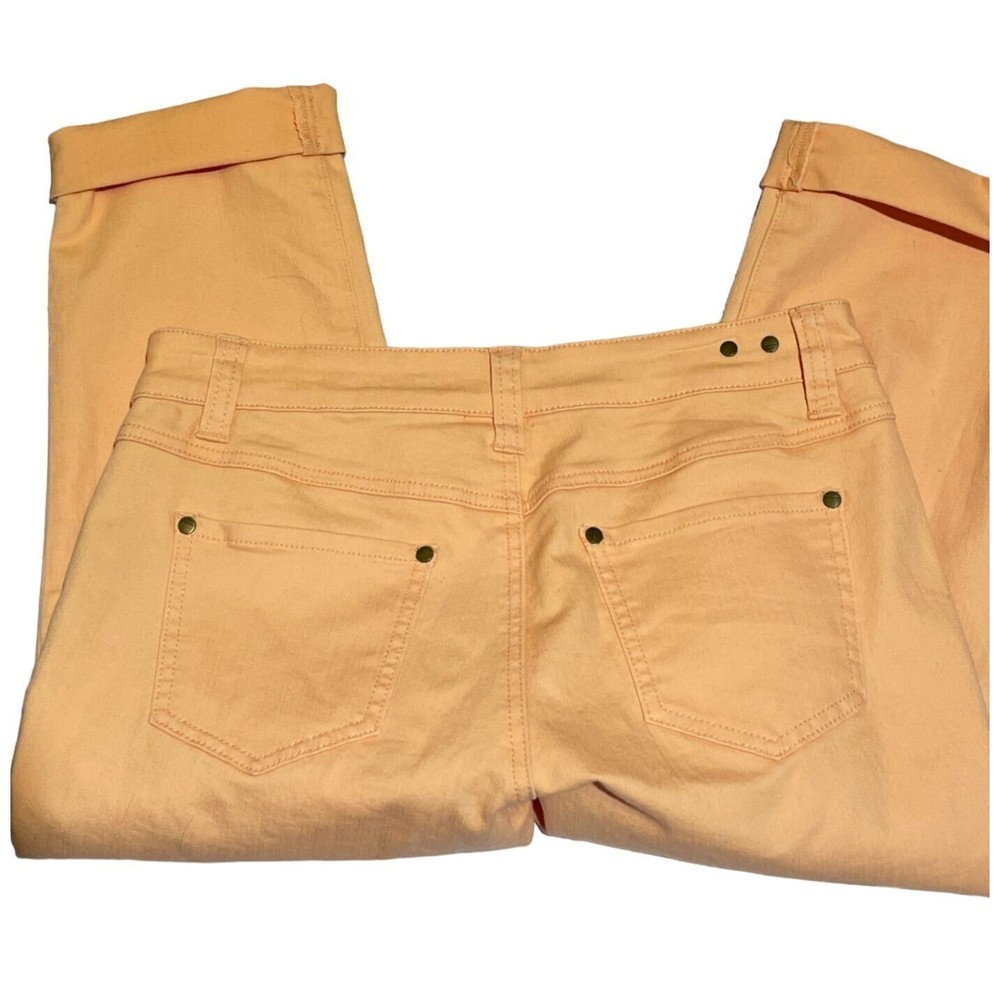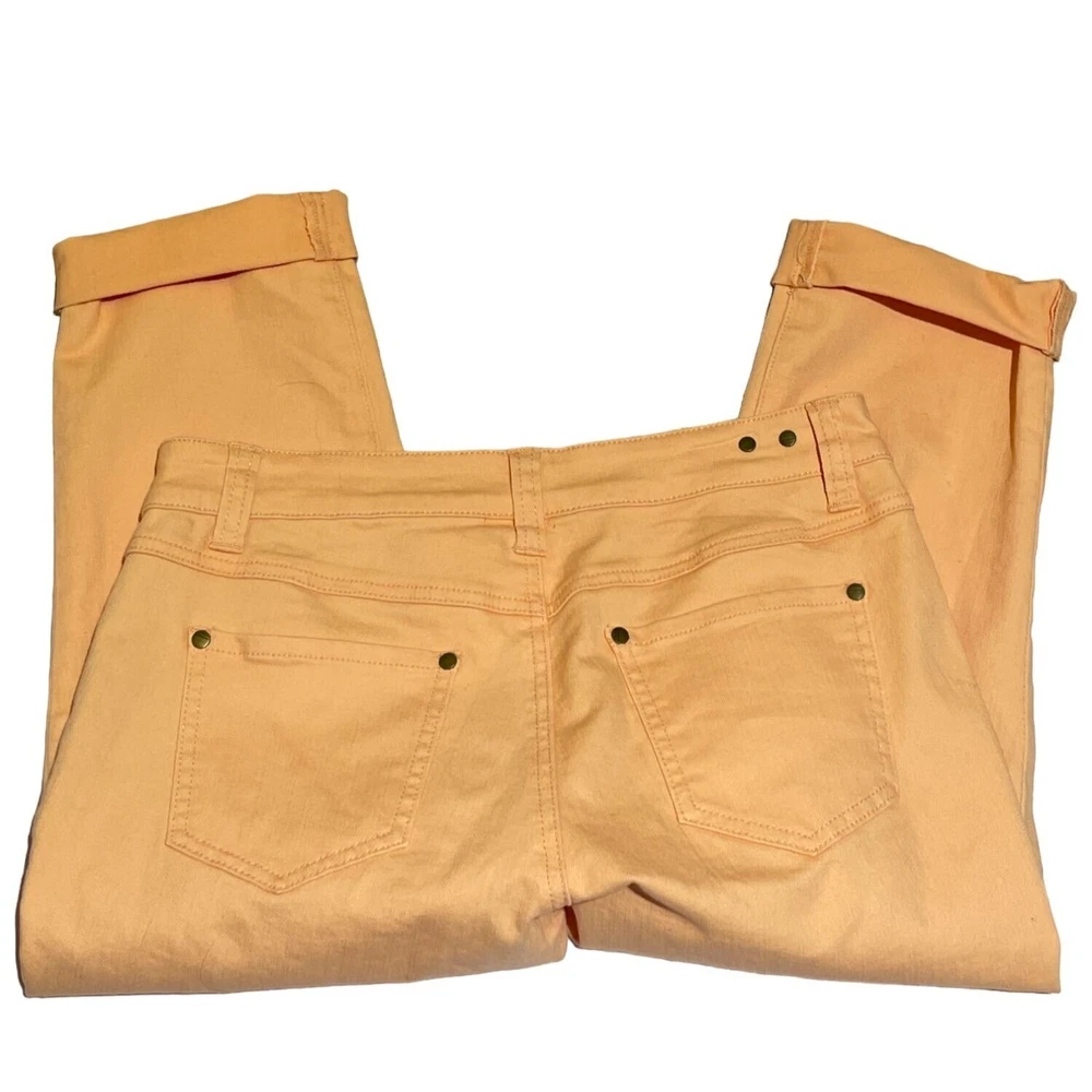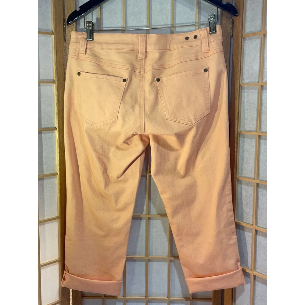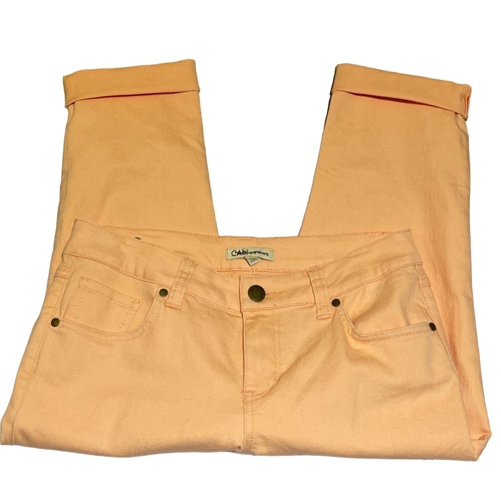 Super cute, summery pedal pusher style jean capris from cAbi. Size 4. Cuffed hems. Flat front. 99% cotton, 1% spandex. Machine washable. Made in China. Excellent condition. Nonsmoking home. Approximate Measurements: Waist: 16" one sided, unstretched Length: 27" Inseam: 19" Rise: 8.5" Thanks so much for looking! Check out my other items - I love to bundle and accept reasonable offers! gg124