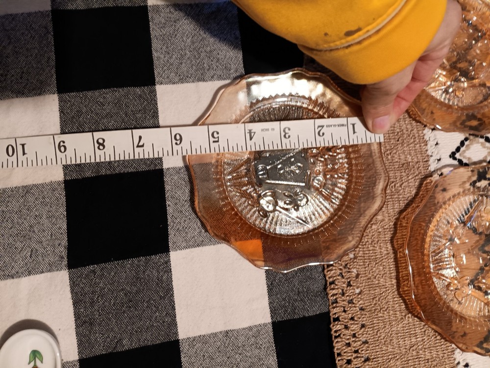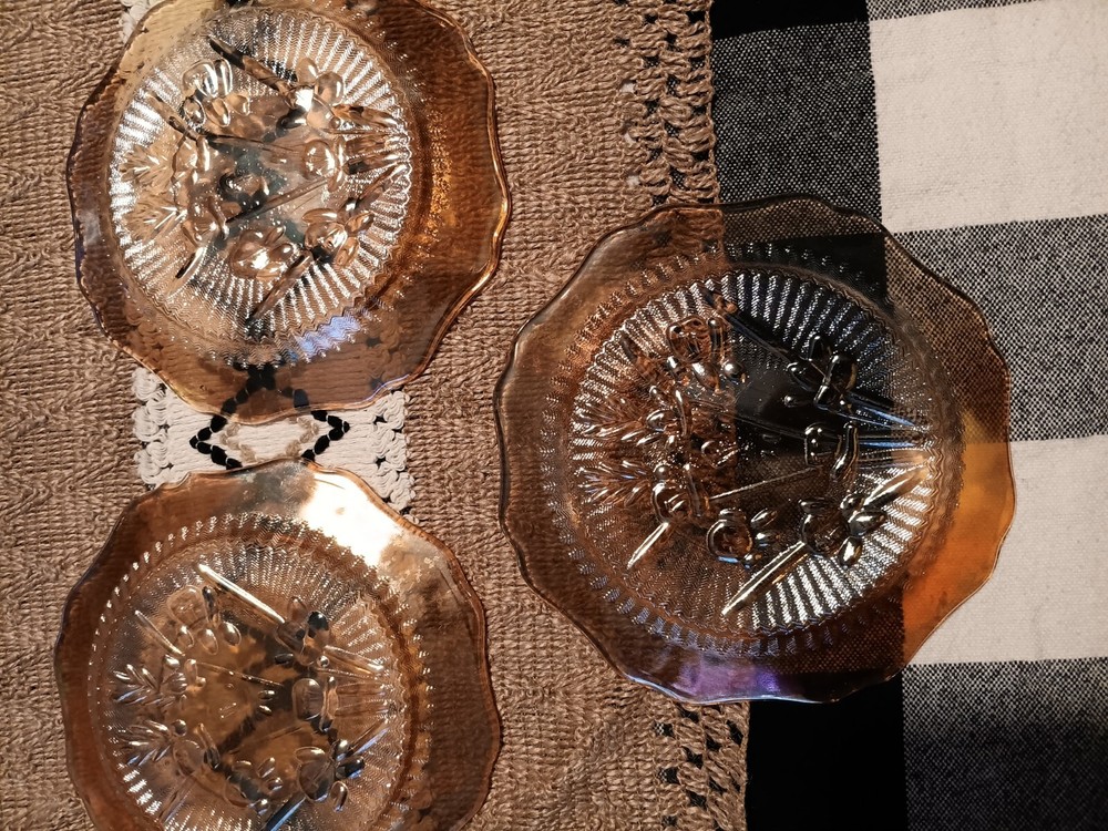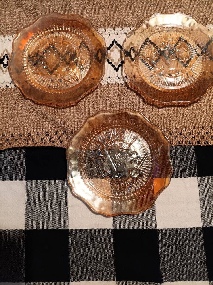 The product is a set of three carnival glass plates in orange color with a floral pattern. The plates are decorative and would be a stylish addition to any dining table. Excellent condition. No chips ...