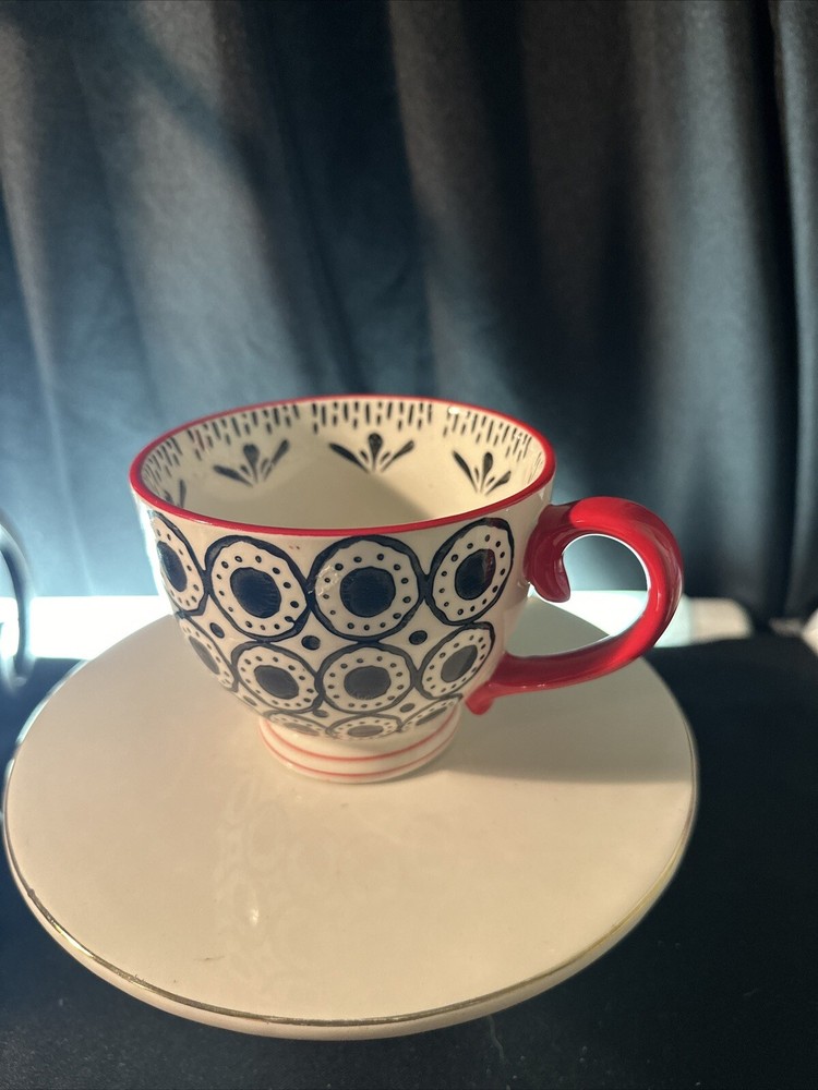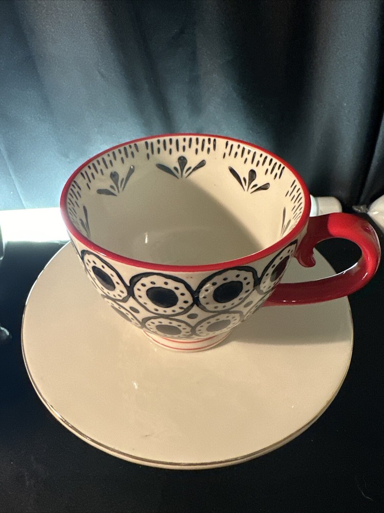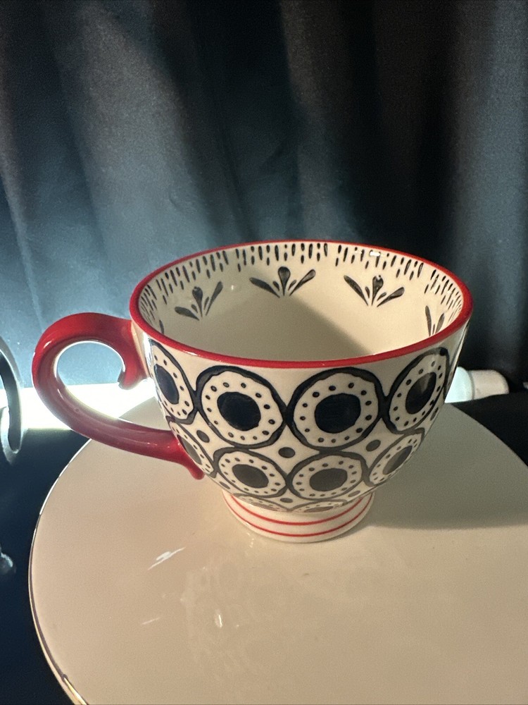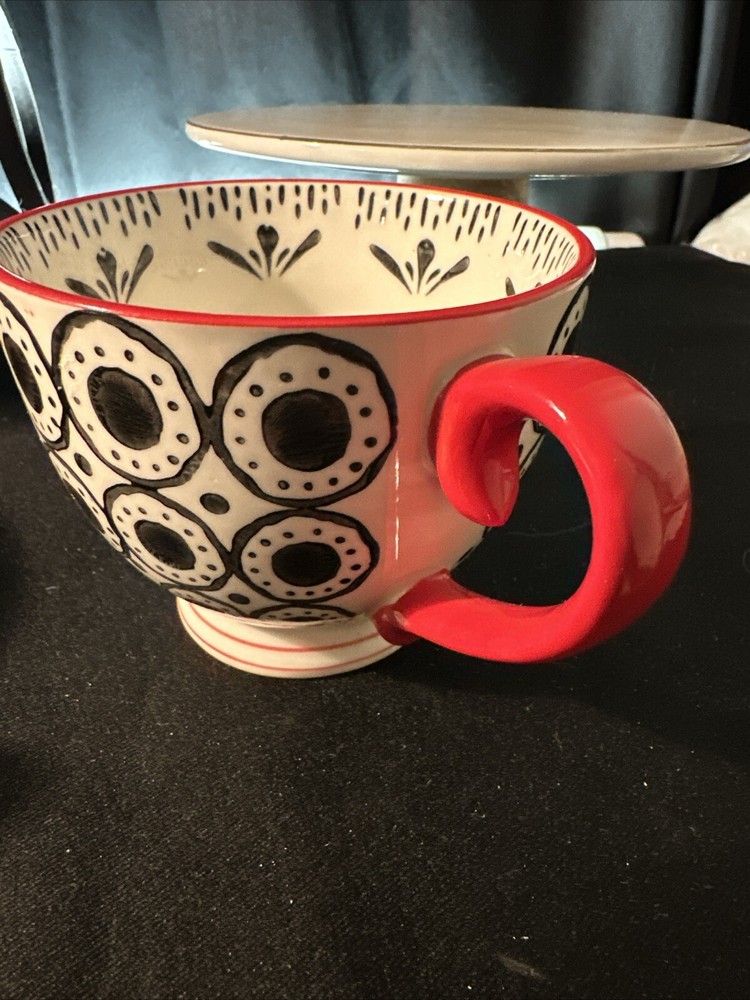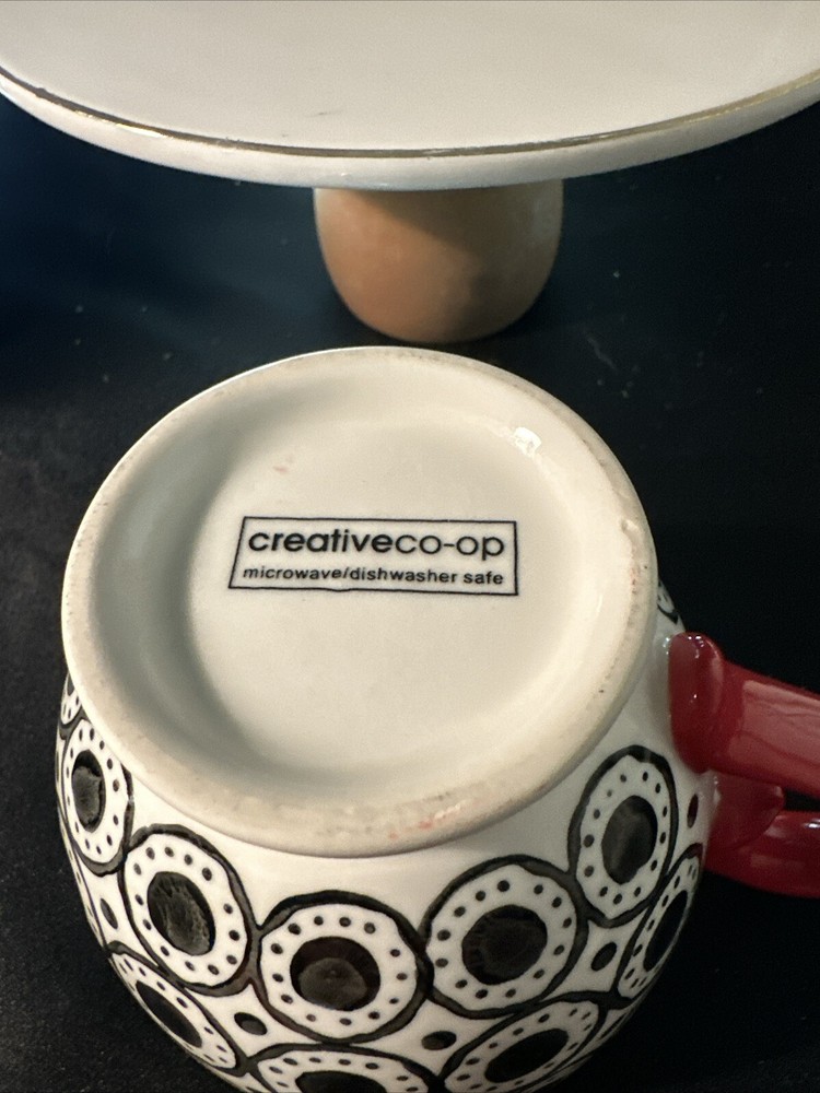 Elevate your morning ritual with the Creative Co-op Tea Coffee Mug, boasting a vibrant Boho design that adds a splash of color to your daily routine. New without tags. The cup includes two mugs, each featuring a striking black and red pattern that embodies a Bohemian style. Crafted from durable stoneware, these mugs are designed for both hot and cold beverages, making them a versatile addition to any kitchen. With a comfortable height of 3.25 inches, these round mugs are perfect for your favorite beverage, whether it's a morning coffee or an evening tea. They are also practical, being both dishwasher and microwave safe, simplifying your daily care routine. Ideal for all occasions, these mugs blend functionality with a flair for style, making them a great choice for any home.