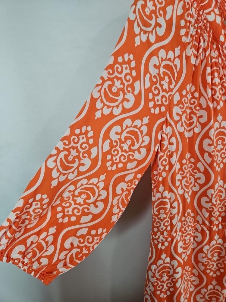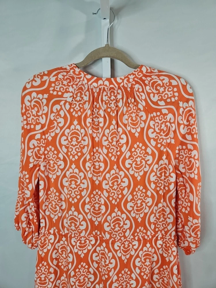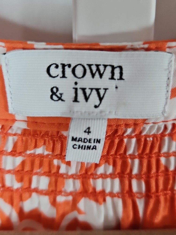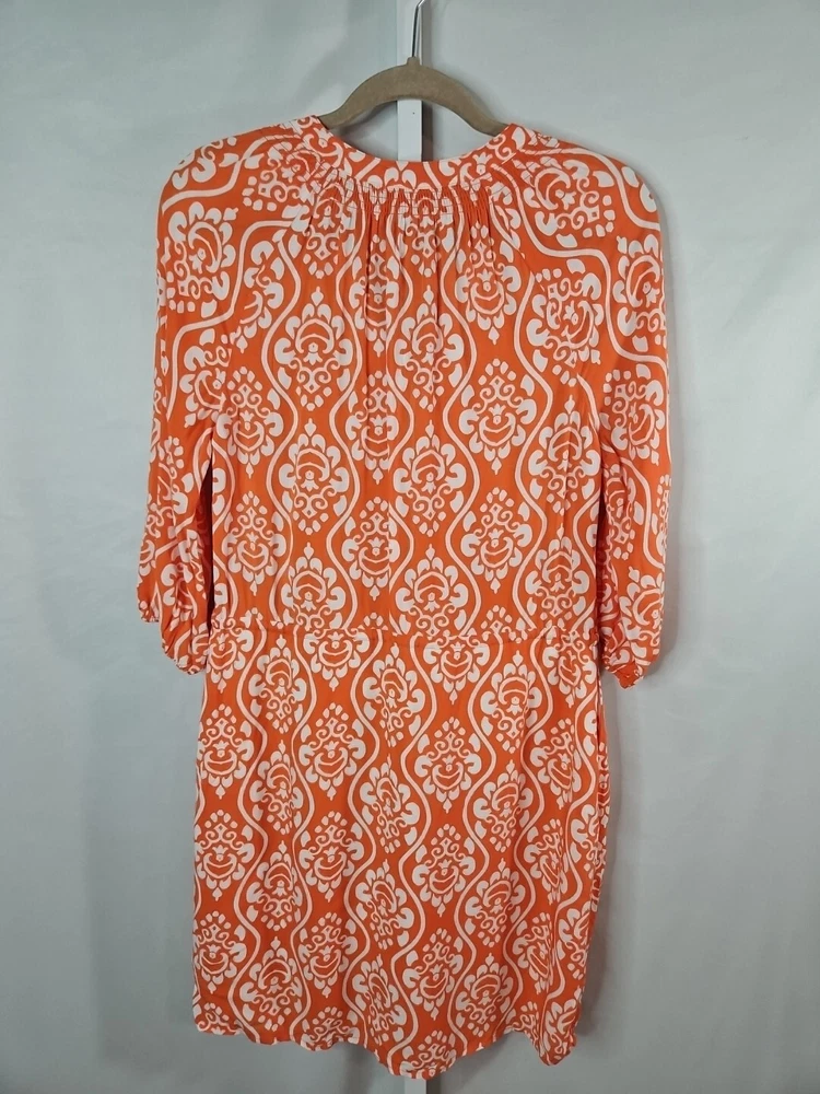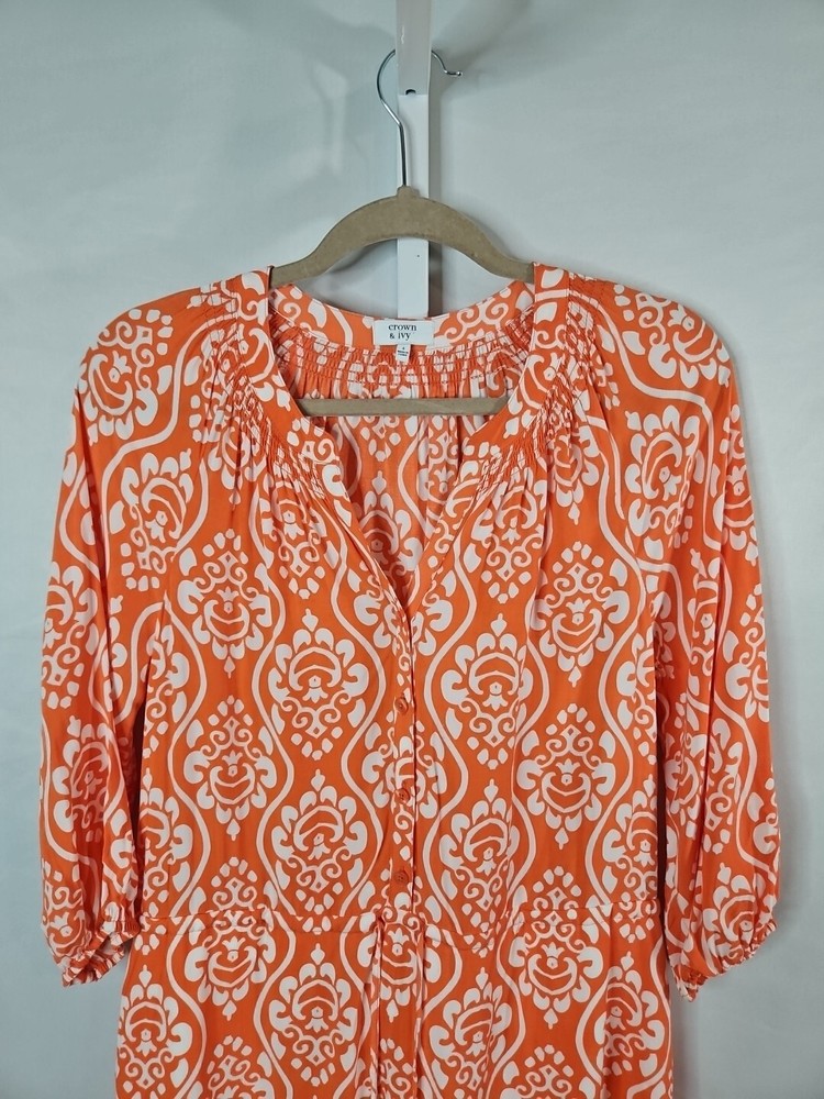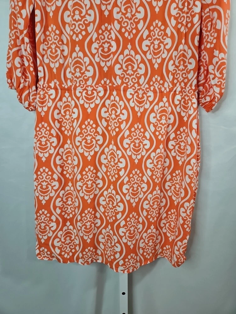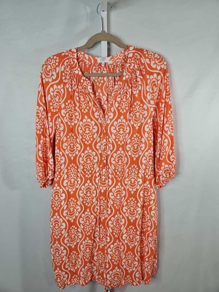 This Crown & Ivy dress in a vibrant orange and white geometric pattern is perfect for a casual beach day. The dress features a V-neckline, raglan sleeves, and a drawstring waist for a comfortable fit. Made from soft rayon fabric, this knee-length shift dress is ideal for the summer and spring seasons. The dress is available in size 4 and is suitable for regular-sized women. The multicolor design adds a touch of fun to your wardrobe, making it a great addition to your collection. Whether you're heading to the beach or attending a casual picnic, this dress is sure to make you stand out.