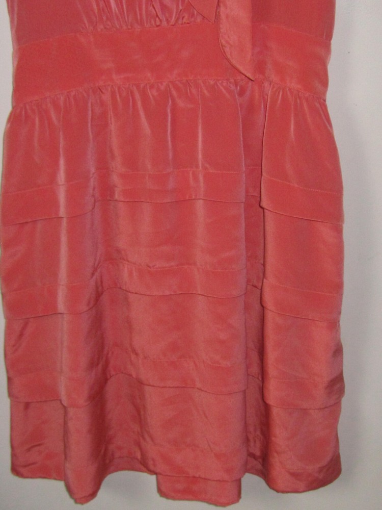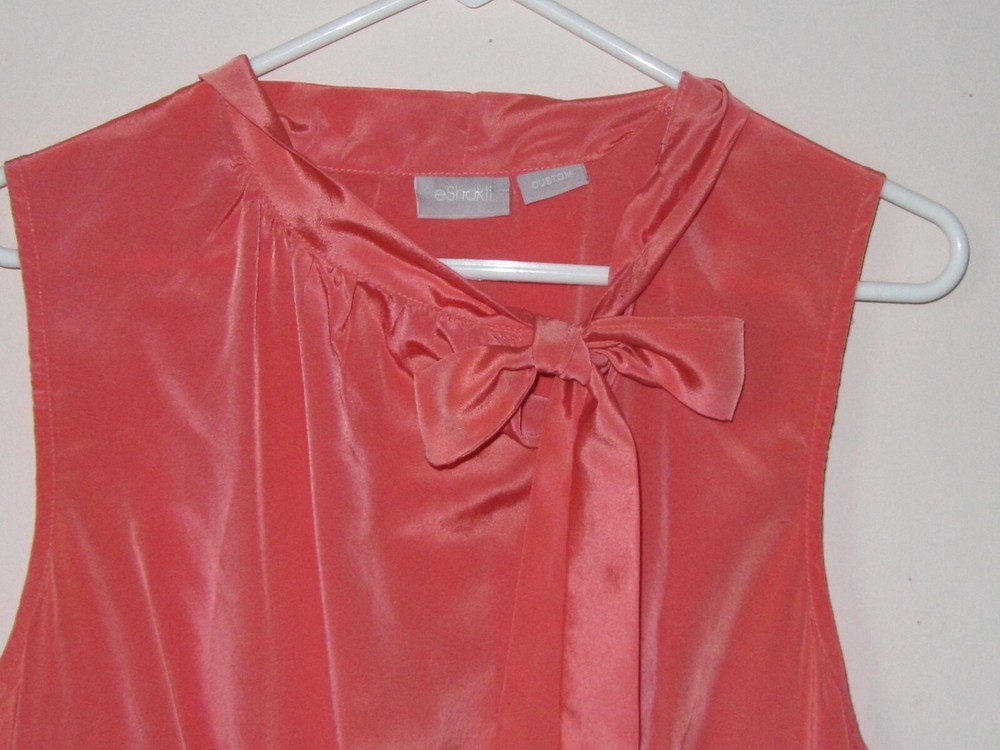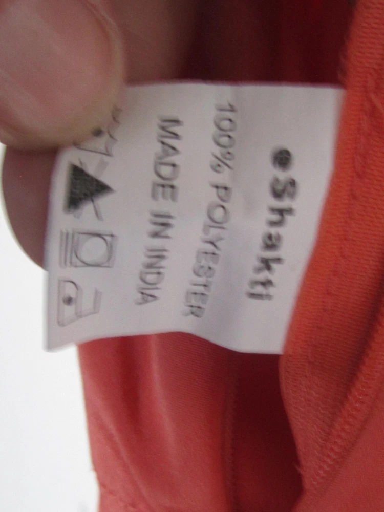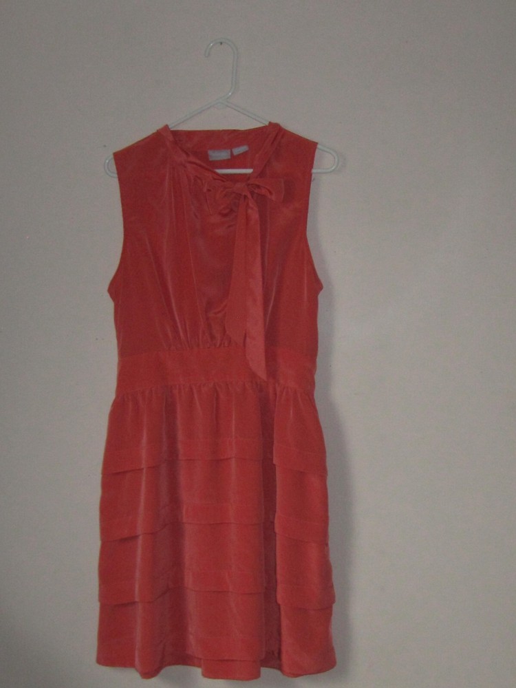 eShakti Short/Mid Length Orange Tangerine Dress with off center tie neck. Elastic Waist. Tiered skirt. 40" Bust-armpit to armpit. 32" Waist plus elastic. 38" overall length. 100% Polyester.