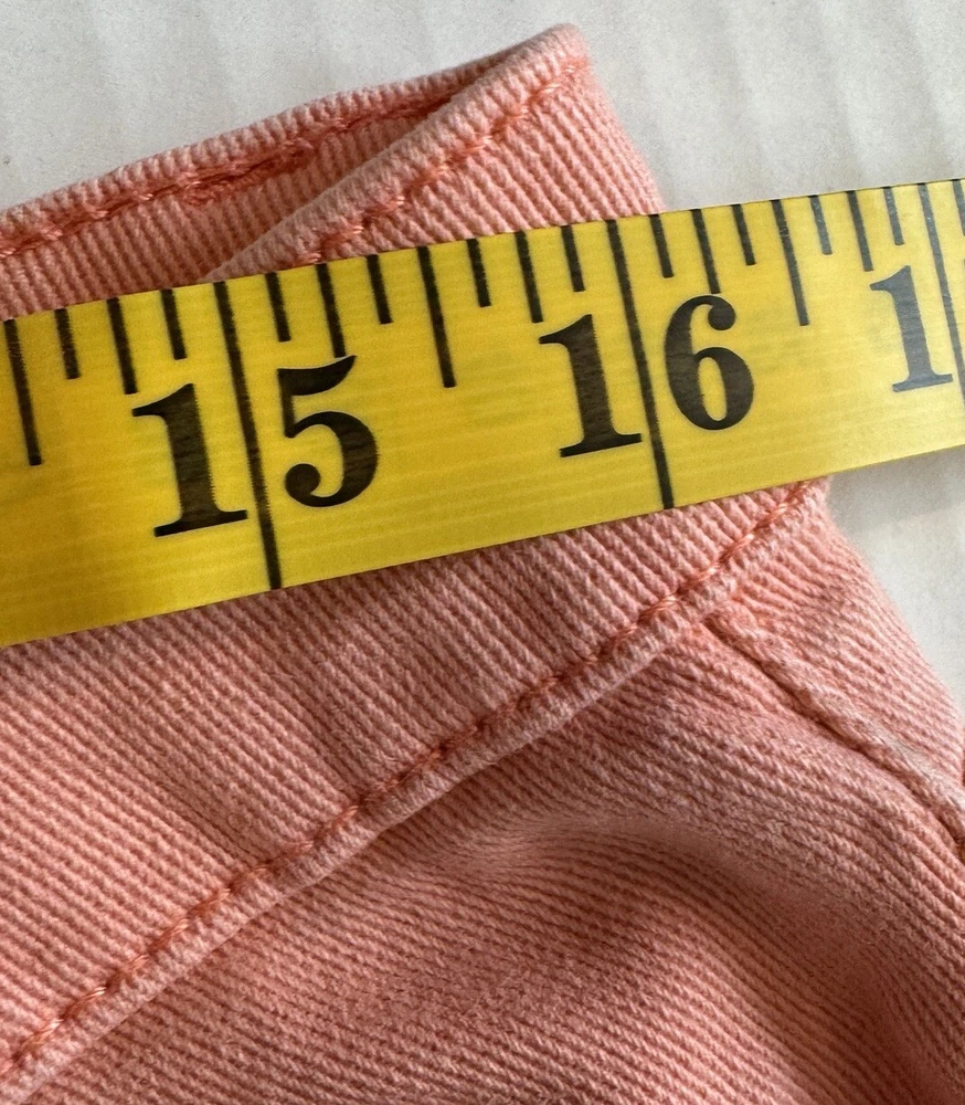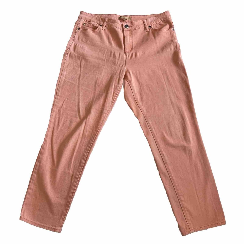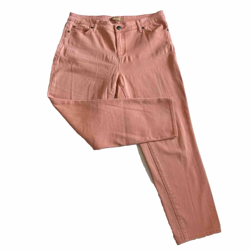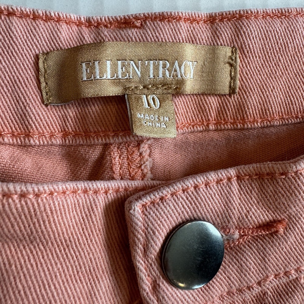 ellen tracy peach/orange ankle jeans sz 10 mid-rise perfect for casual, travel, vacation Elevate your wardrobe with these stylish peach orange ankle jeans from Ellen Tracy. These mid-rise casual travel vacation pants feature a solid pattern with a zip and button closure. Made from a comfortable cotton blend denim fabric, these jeans are machine washable and easy to care for. The waist size is 32 inches, and the inseam measures 26 inches, making them a great fit for women in size 10. These regular-fit, denim-style jeans come in a vibrant orange color that will be sure to add some fun to your outfit. They have a mid-rise, which falls between 8.5-10.5 inches, and a stylish ankle cut. The fabric wash is medium, and the garment care is machine washable. These jeans are versatile and can be easily dressed up or down, making them perfect for any occasion.