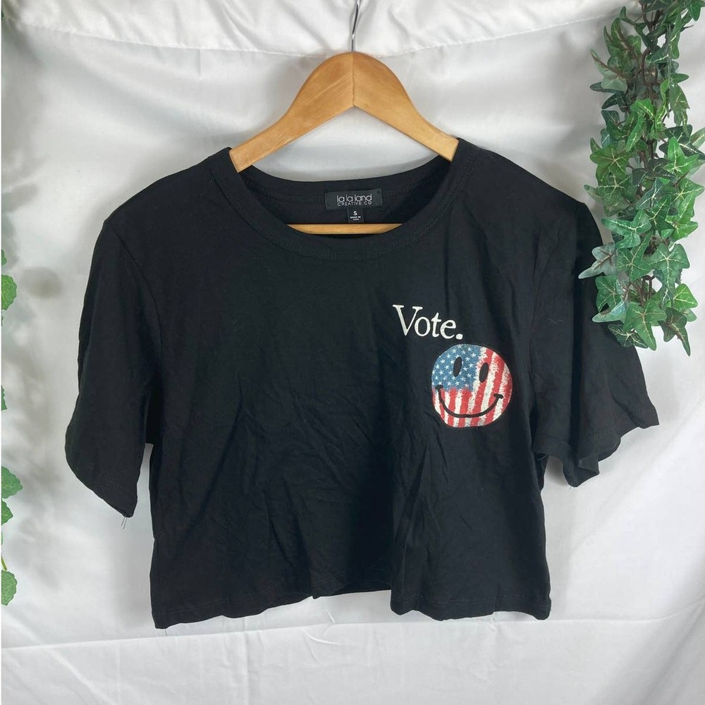 <![CDATA[<div>la la land creative co vote crop top United Stats flag smiley face detail new without tags length 17" pit to pit 19" measurements are approximate...