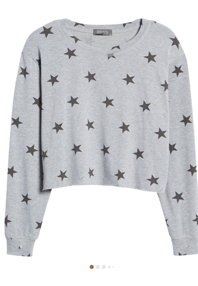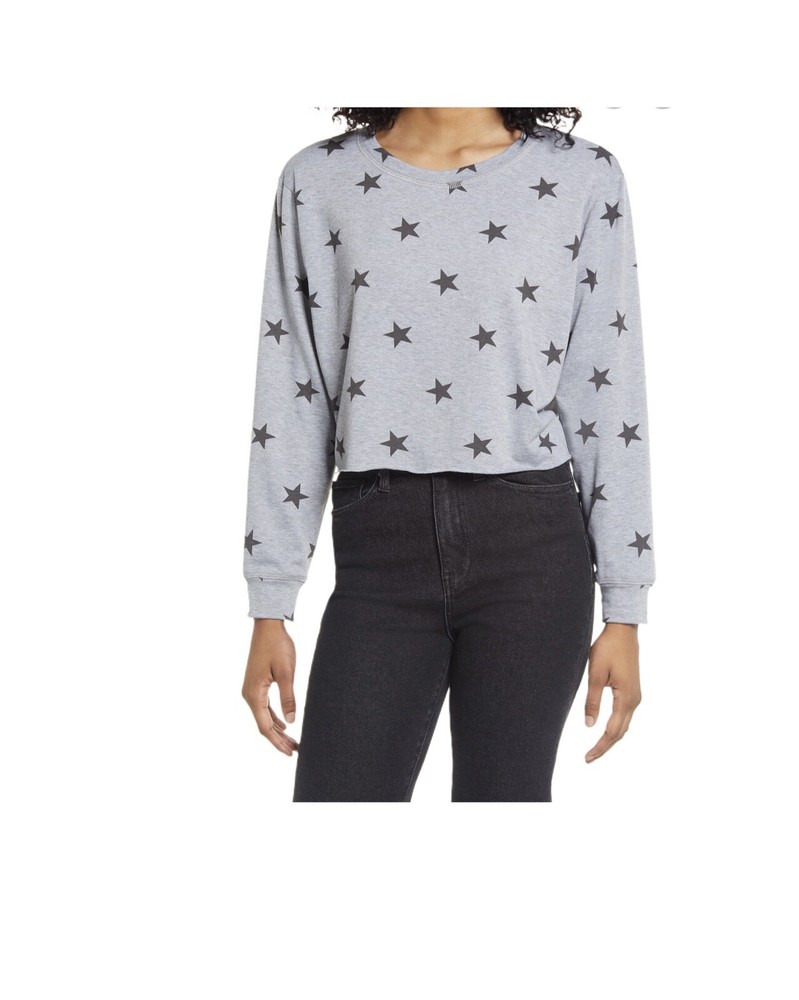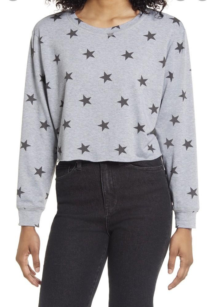 lala land creative co gray cropped sweatshirt with black stars women small. A stars print elevates this boxy crop sweatshirt made from a soft French terry. 16”length 18 inches pit to pit Crewneck Long sleeves 90% polyester, 7% rayon, 3% spandex Machine wash, tumble dry Made in the USA of imported fabric Women's Clothing Inv26a