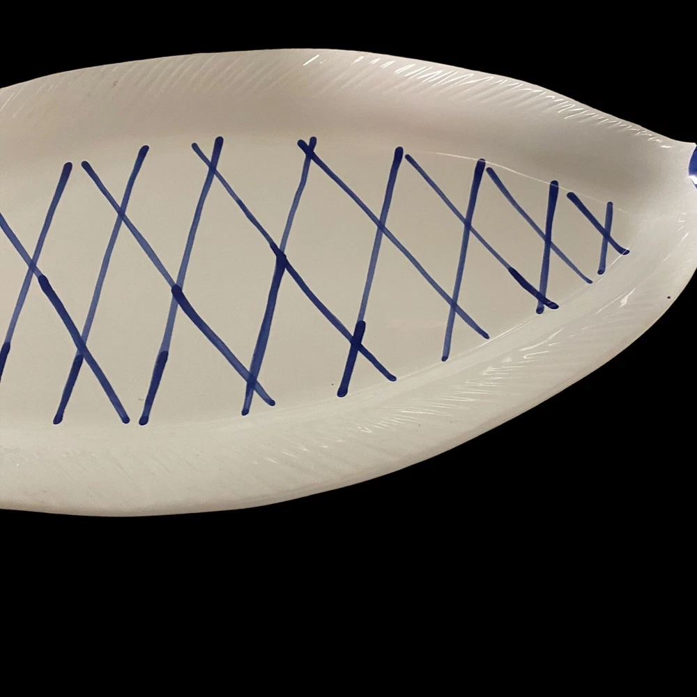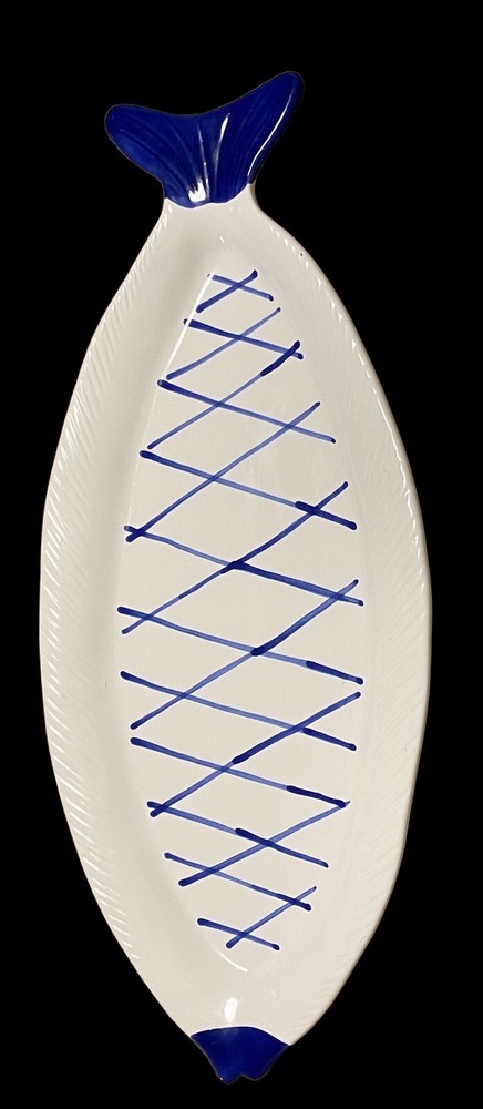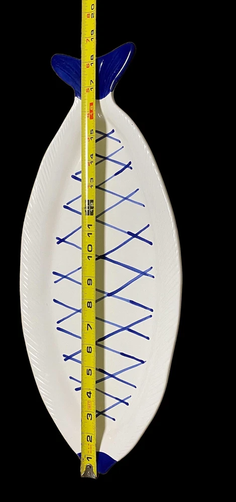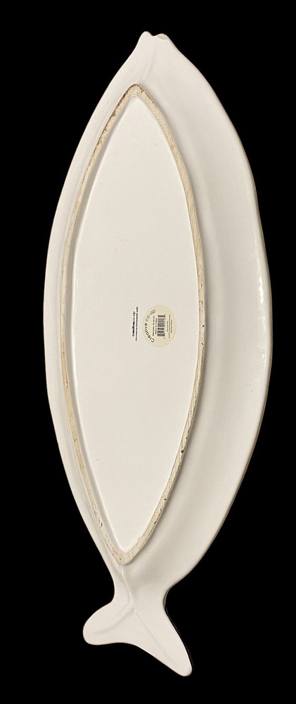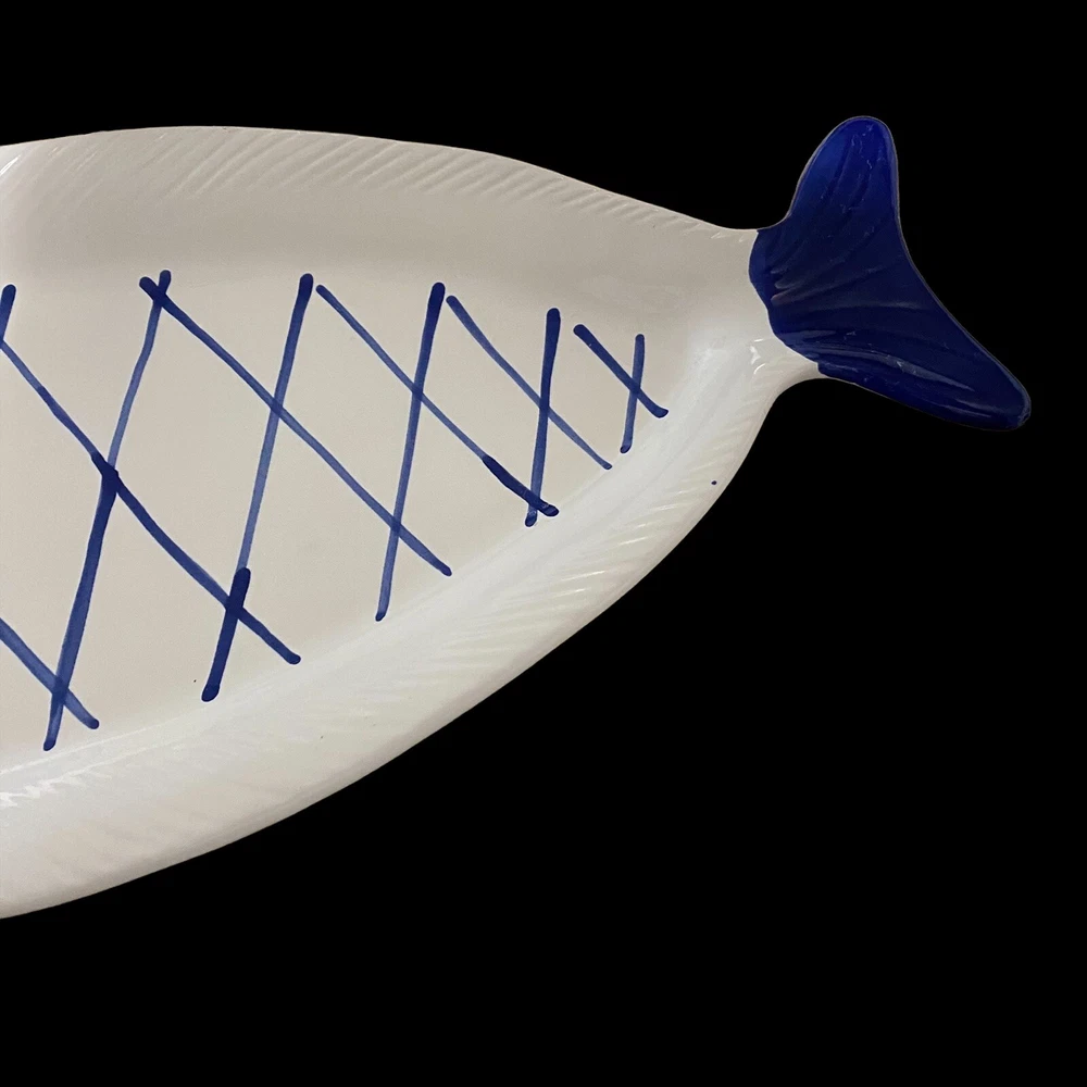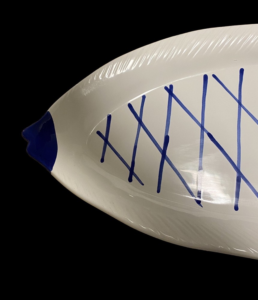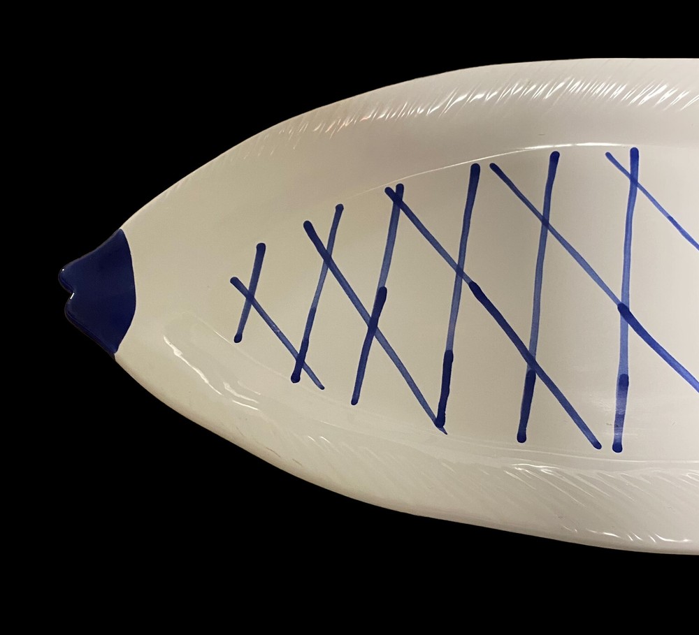 large fish ceramic platter hand painted dolomite creative co op 18”. The pictures are the entire description. This platter is in really great condition and is beautiful. It is handpainted featuring bright blue and white ceramic. There is a small flaw. It is a chip underneath the mouth of the fish on the backside. See the last few photos for details. This will come securely wrapped and shipped in a box. Thank you for shopping with us.