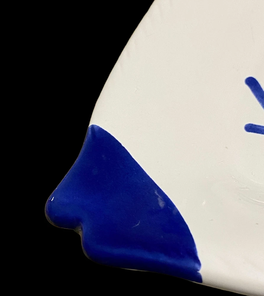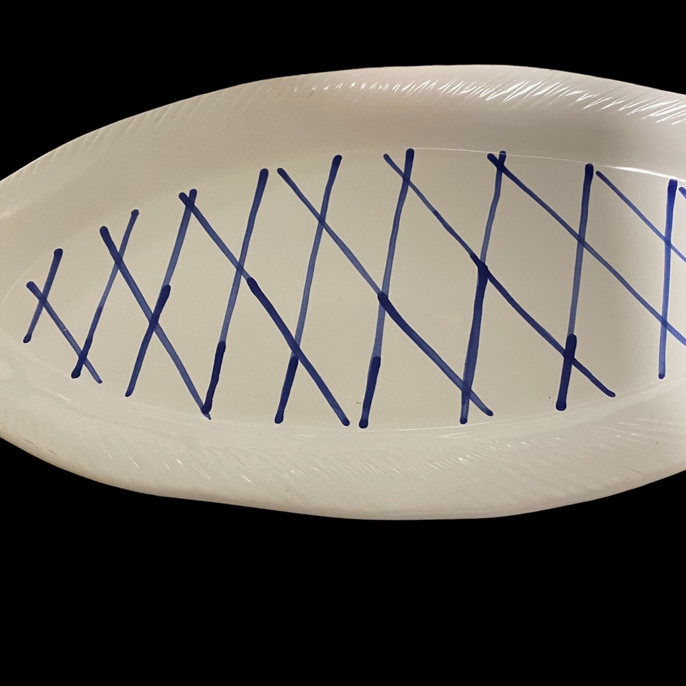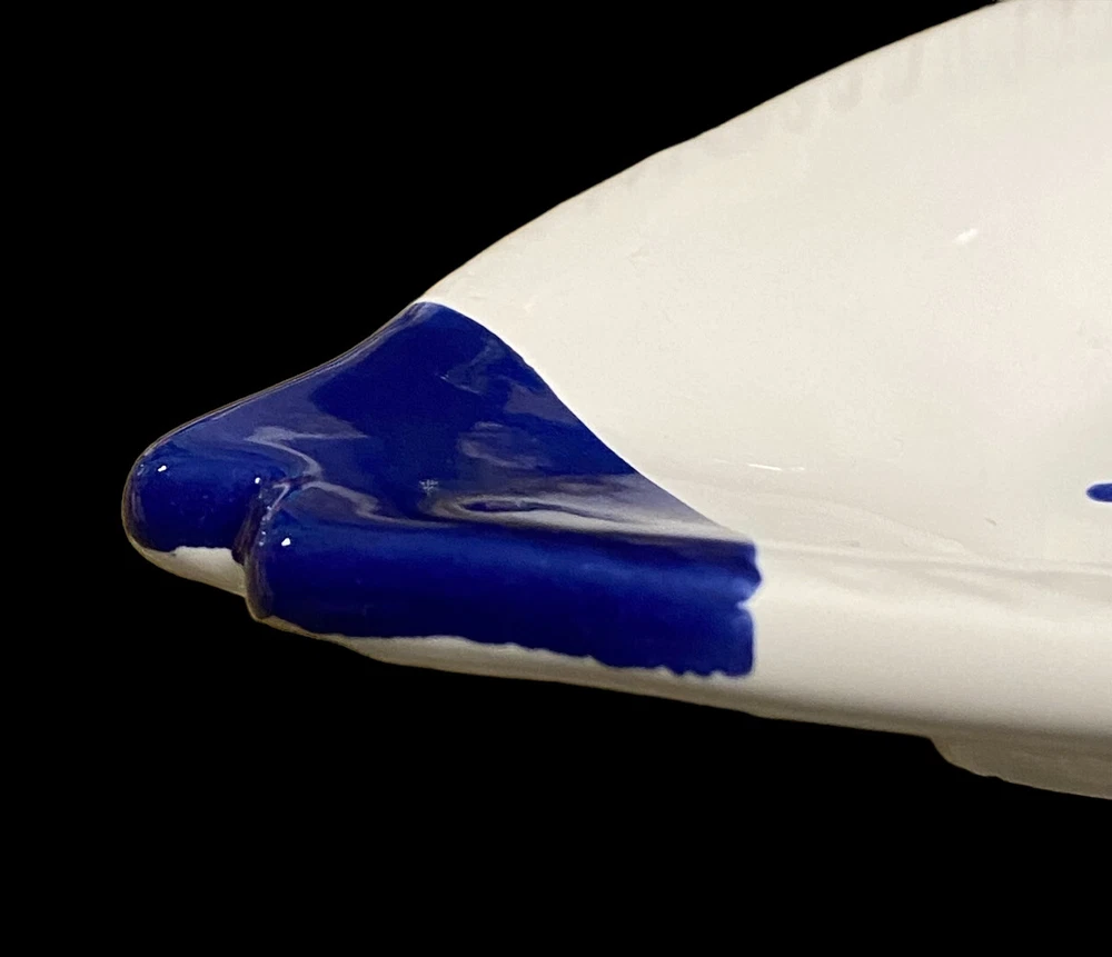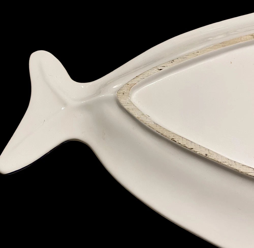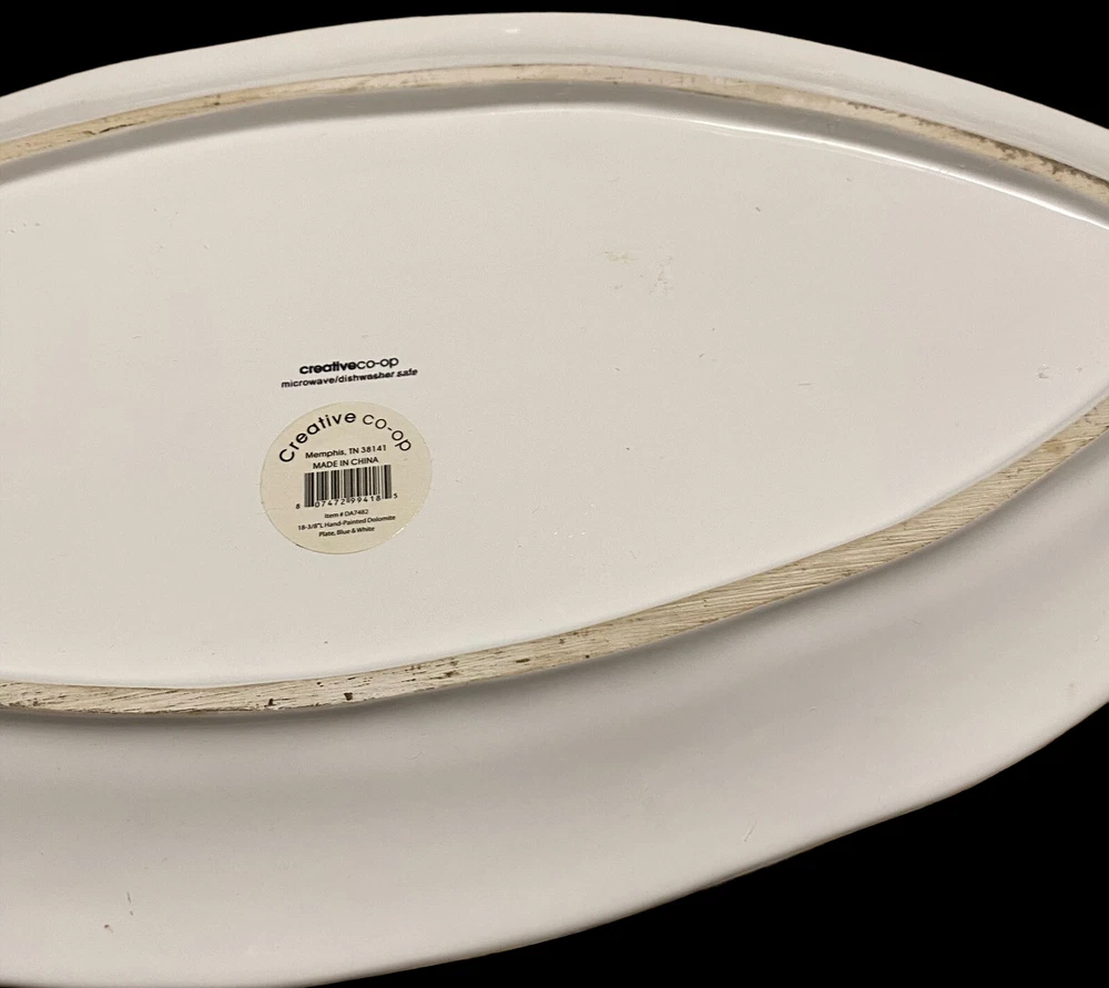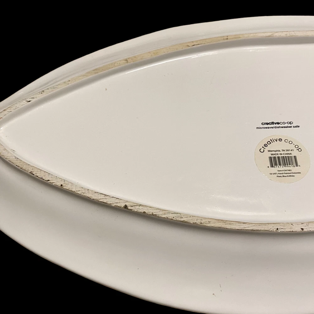 large fish ceramic platter hand painted dolomite creative co op 18”. The pictures are the entire description. This platter is in really great condition and is beautiful. It is handpainted featuring bright blue and white ceramic. There is a small flaw. It is a chip underneath the mouth of the fish on the backside. See the last few photos for details. This will come securely wrapped and shipped in a box. Thank you for shopping with us.