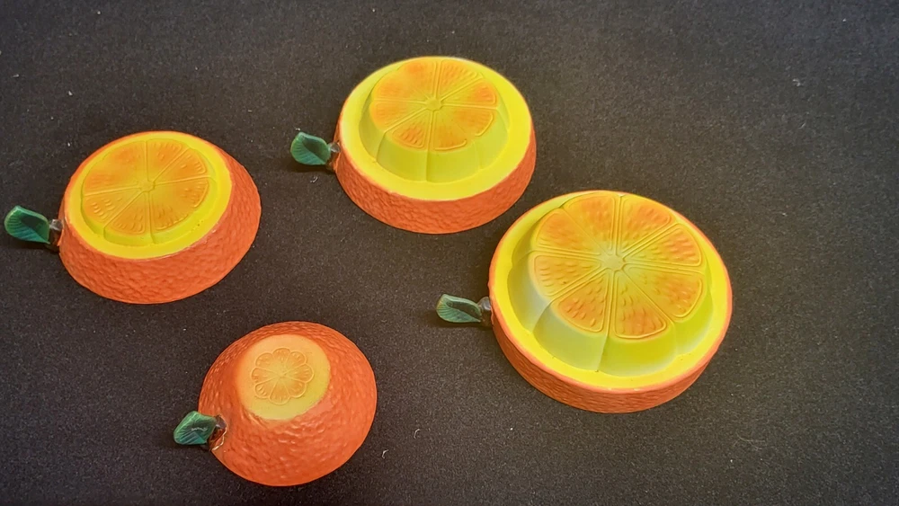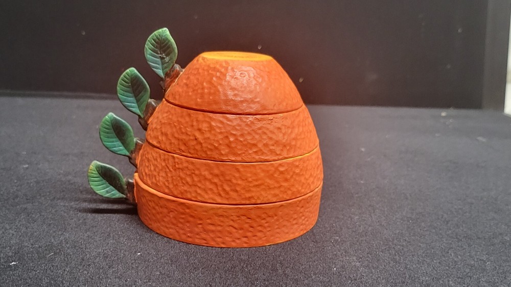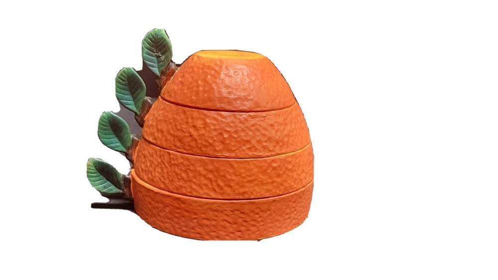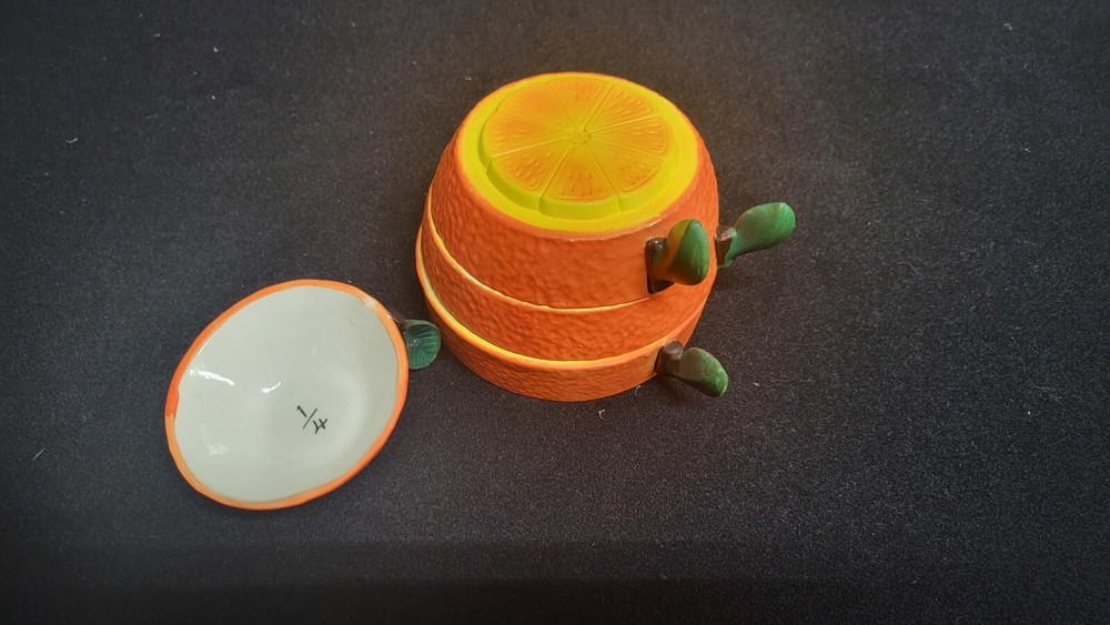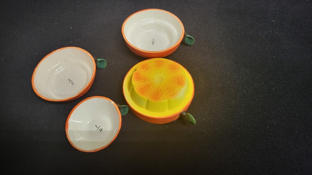 mid century Stackable sliced orange Novelty Measuring Cups Set made in Japan. With original foil label " fine quality LEGO Japan " This set is an excellent condition unused. Funky vintage kitchen collectable great color.