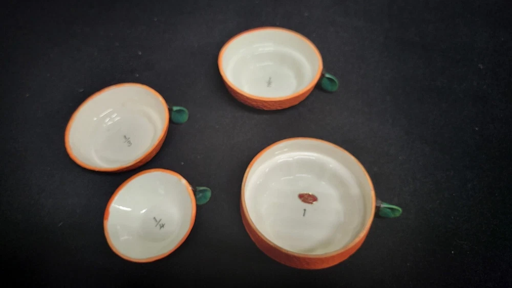 mid century Stackable sliced orange Novelty Measuring Cups Set made in Japan. With original foil label " fine quality LEGO Japan " This set is an excellent condition unused. Funky vintage kitchen coll...