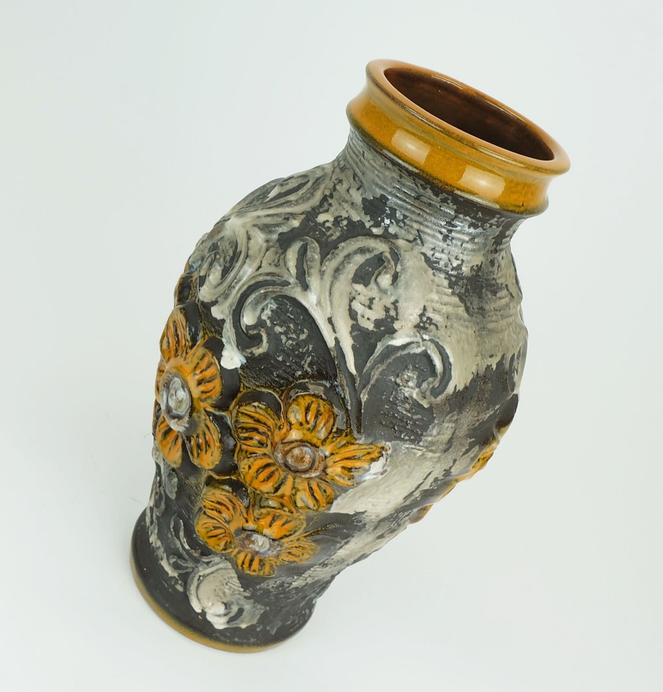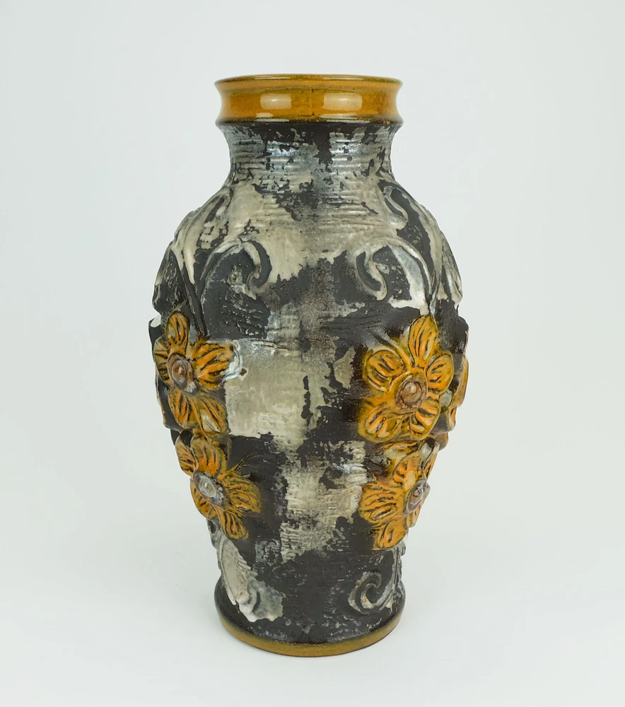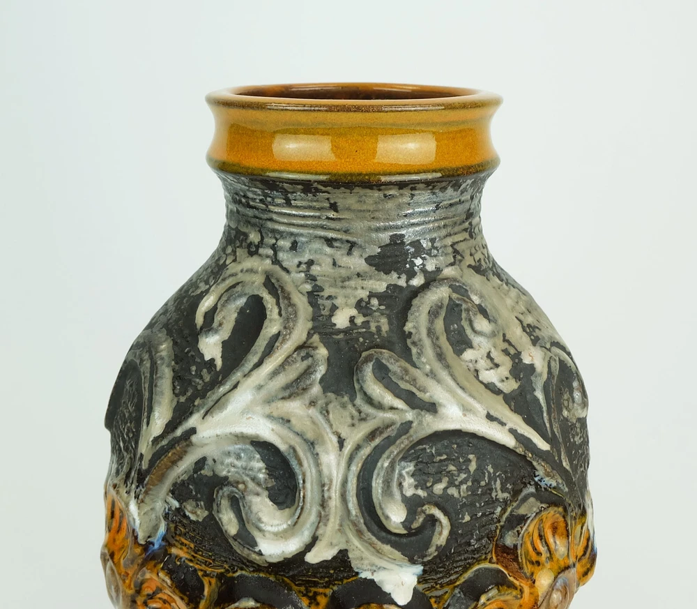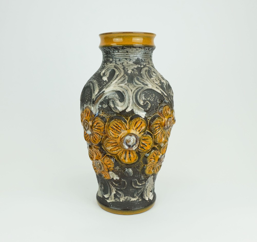 Very beautiful 1960s ceramic vase manufactured by Carstens Toennishof West-Germany. Model 7161-30 with a beautiful combination of patterns and glazes: Floral relief decor in orange combined with ornamental decor in grayish brown and silver gray. Very good condition, no damages. Dimensions in cm: Height 31 cm, width 17 cm. Dimensions in inches: Height 12.2", width 6.69". Weight 1400 gms. ____________________________________________ Worldwide free shipping. ____________________________________________ General information for international customers: Custom duties and other taxes are NOT included in the item price or the shipping cost. Please inform yourself which customs duties fall due when importing into your country. You will receive a tracking number after shipping. We ask that you follow the tracking promptly so as not to miss the delivery date. If the package is returned by the delivery company because the package could not be delivered or was not picked up, any additional costs incurred (e.g. return costs, re-shipment) must be borne by the buyer.