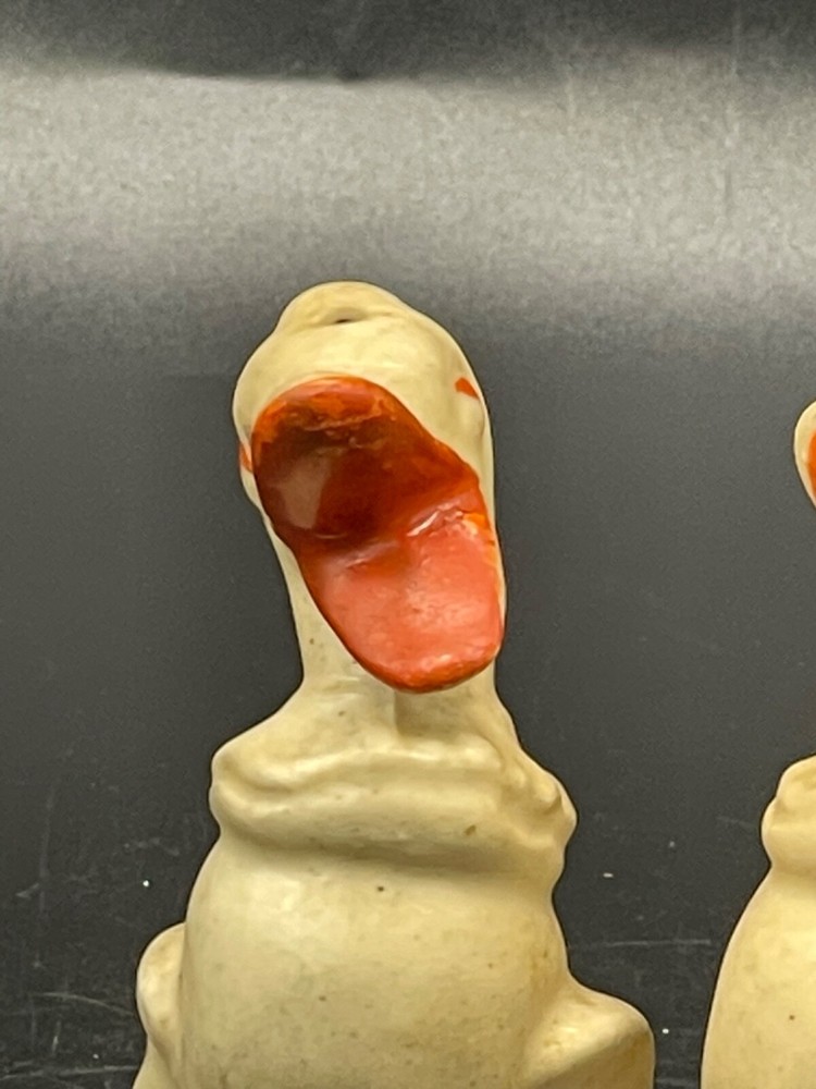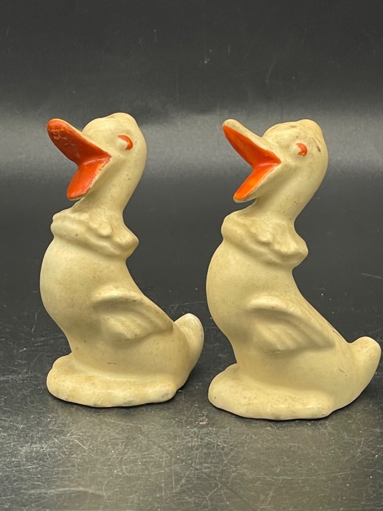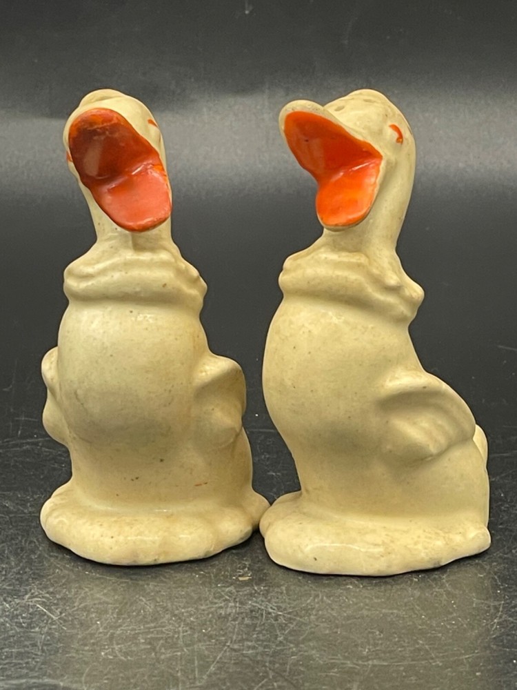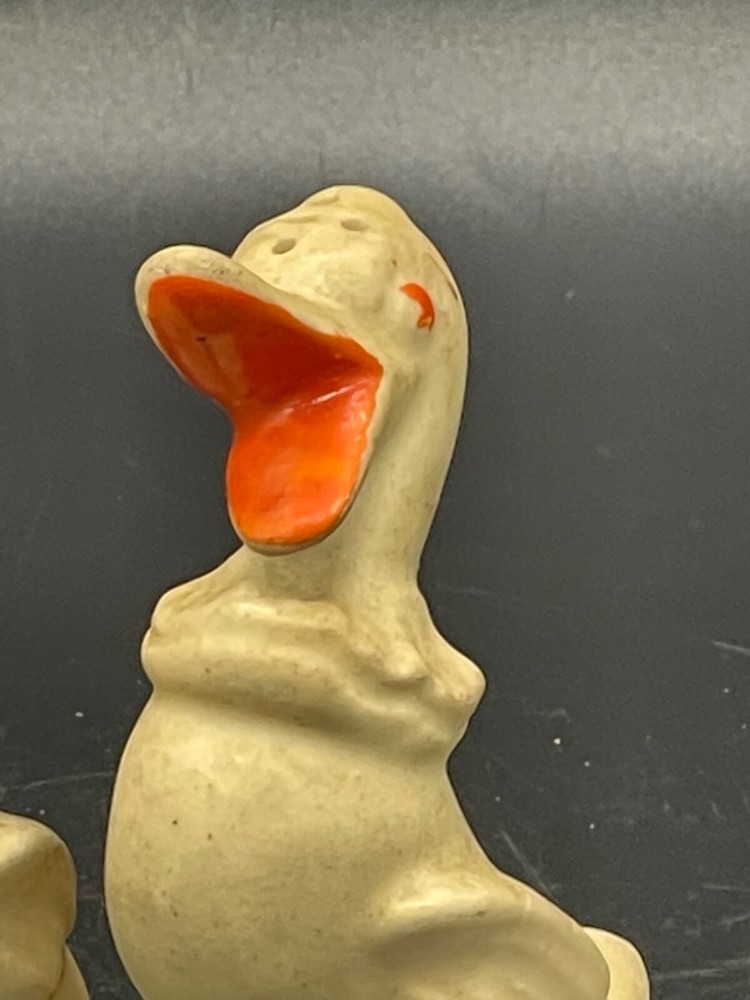 Mid century, ceramic duck salt and pepper shakers beige and orange both have stoppers made in Japan 3 inches high no cracks or chips. Very good vintage condition. Box12/17#a...