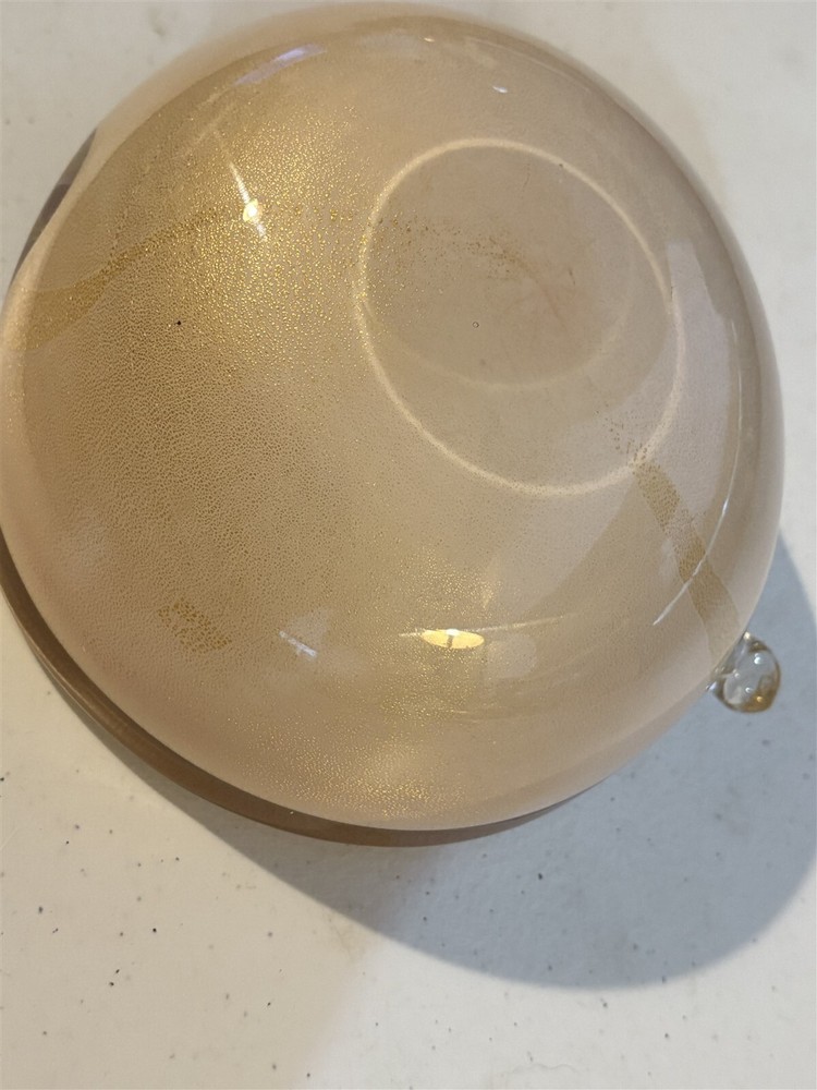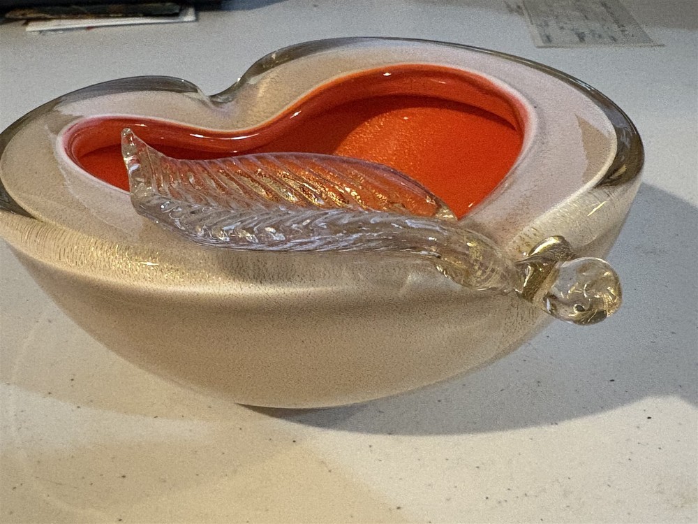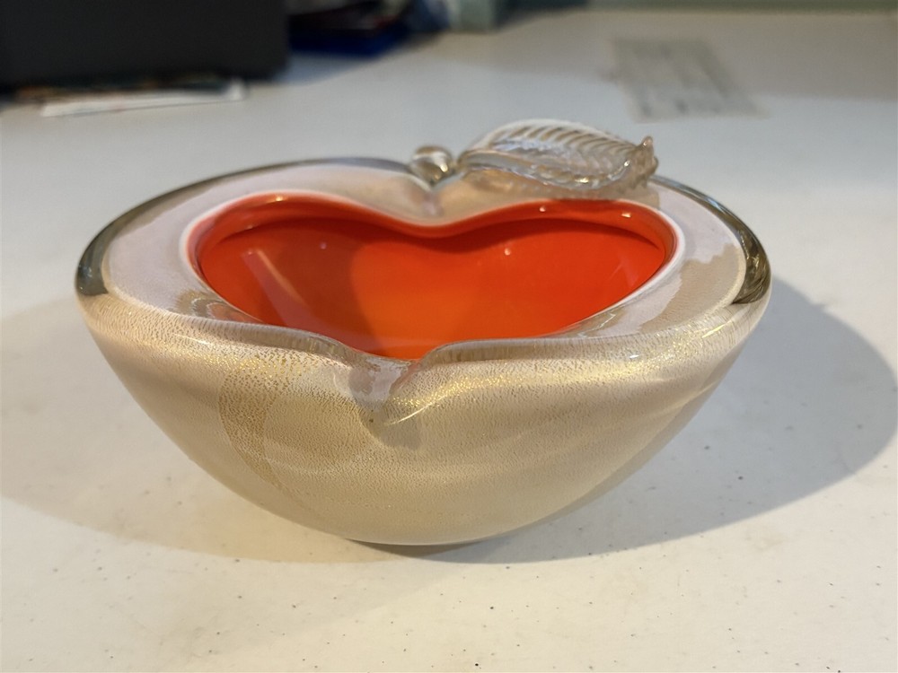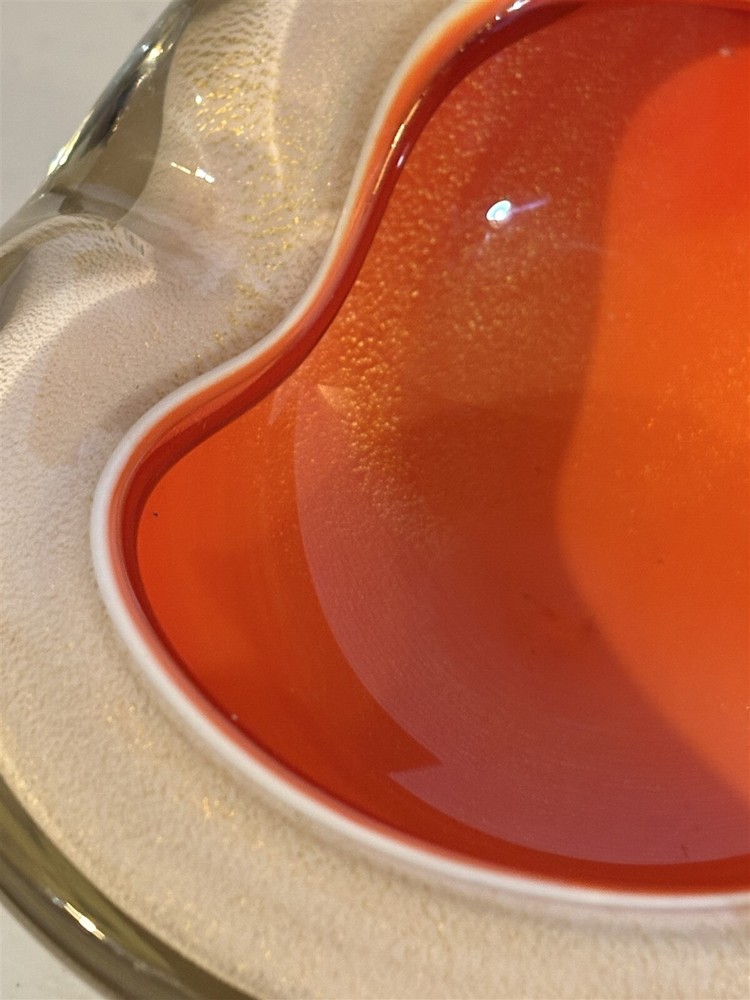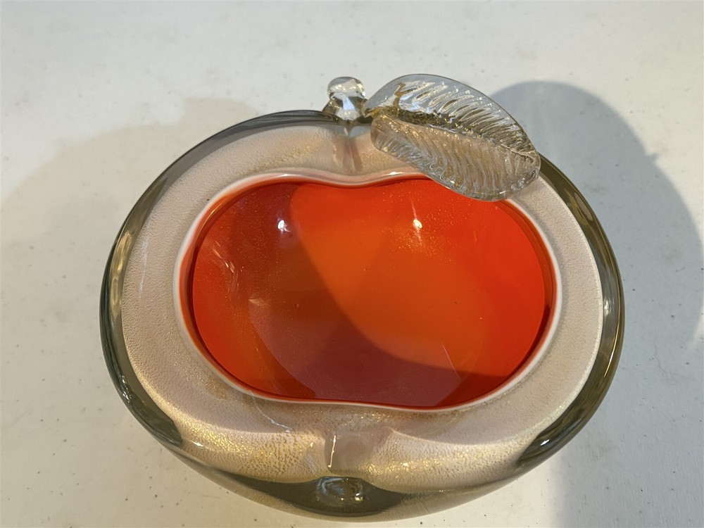 Here is a lovely encased glass ashtray. The design has to be Alfredo Barbini from Italy as it has the apple look or in this case maybe an orange as a tangerine orange is used for the bowl, gold flake in the white on the rest of the color. It's about 6 inches across and weighs a bit less than 2 1/2 pounds. There isn't damage to it so you should be pleased. We will pay for shipping on this into the United States. If you are international, you'll have to pay for it, sorry. Anyhow, I'm just an easy going farmer so if you aren't happy with the item, no big deal, just let me know. I'd rather not ship this internationally because the cost would be horrendous, but if you need a quote let me know. Powered by SixBit's eCommerce Solution