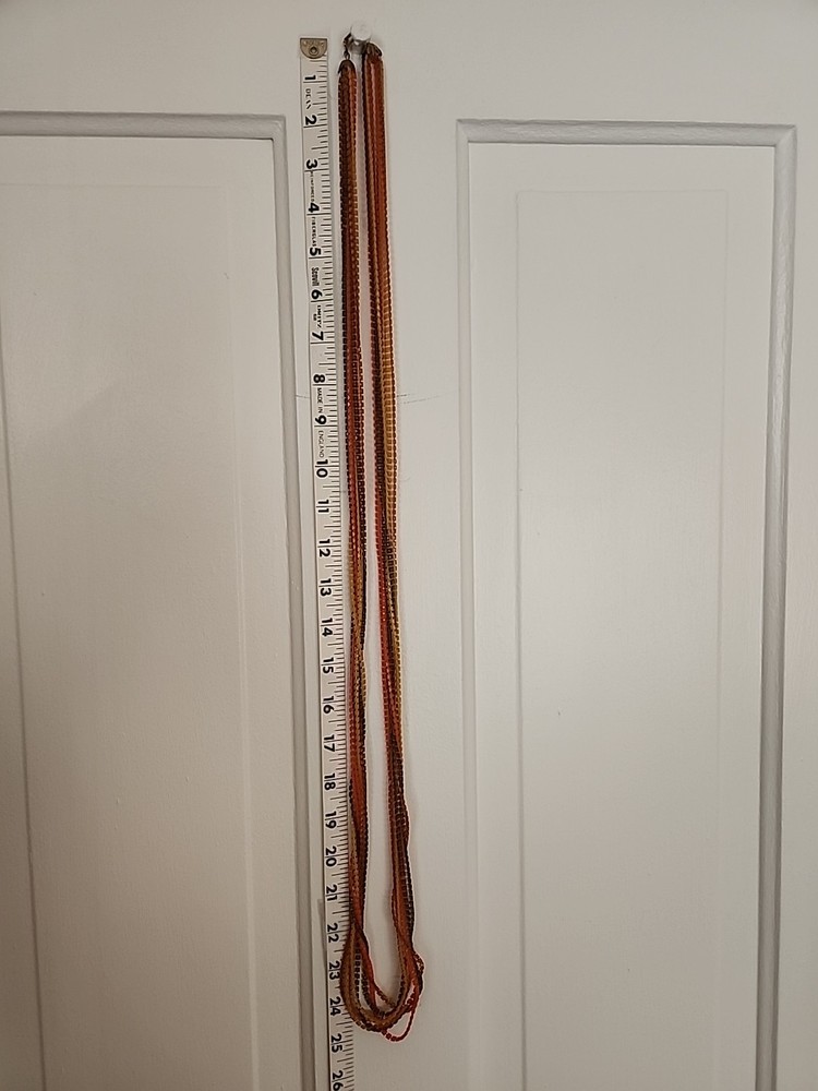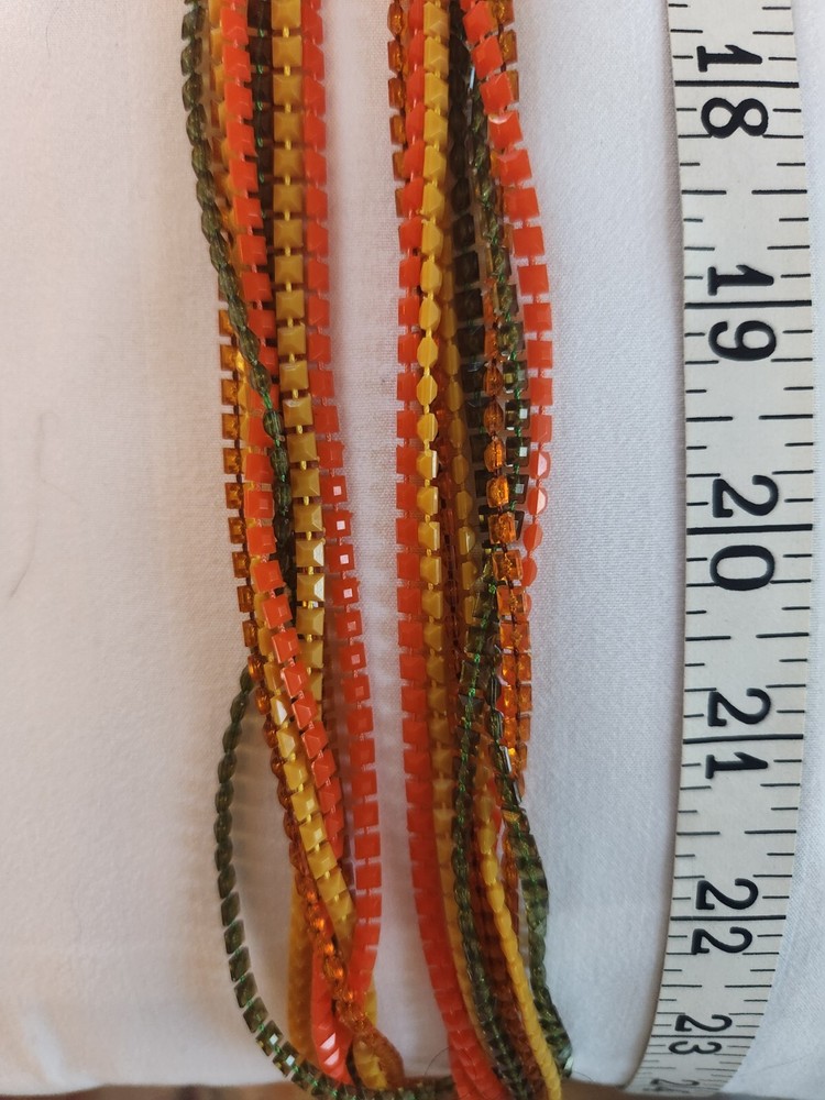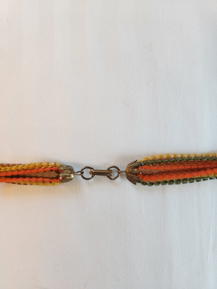 This stunning vintage necklace is a vibrant mid-century treasure, blending bold orange, green, and yellow tones in a playful yet elegant design. The lightweight plastic construction makes it comfortable to wear while adding a nostalgic touch to any outfit. Its unique retro charm stands out, perfect for collectors or anyone who loves statement jewelry with a timeless appeal. A true conversation piece!