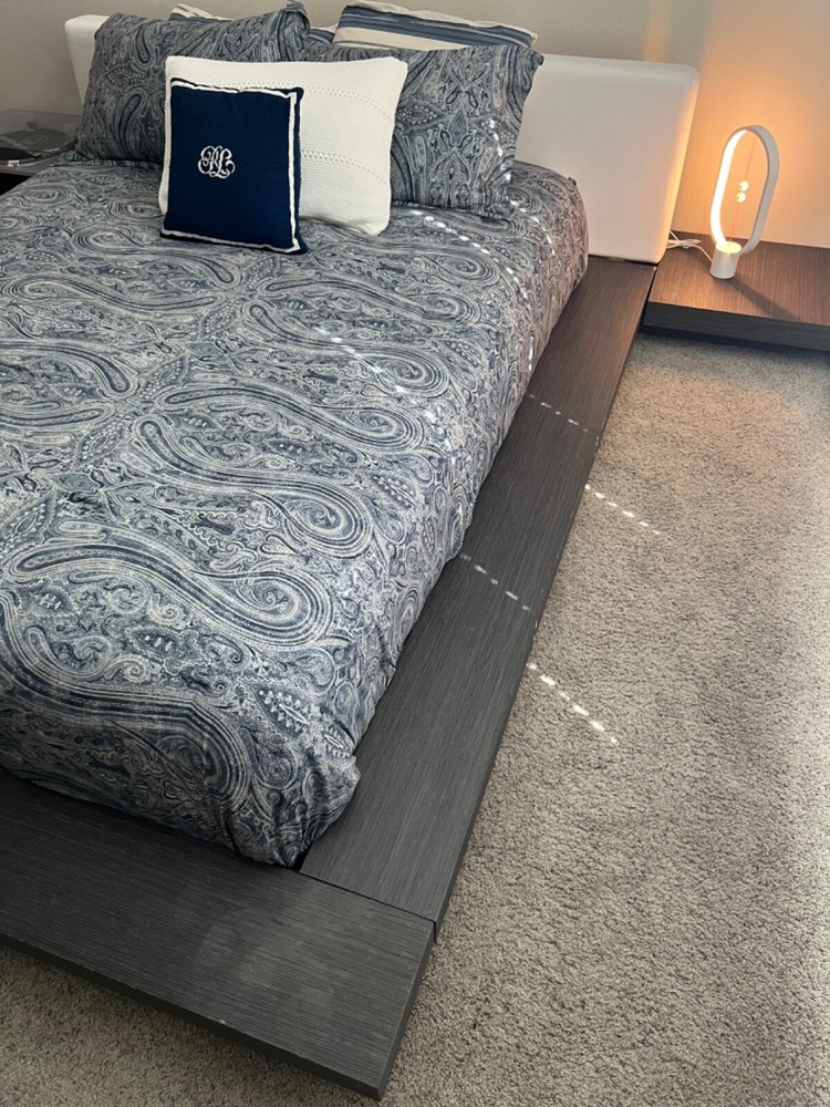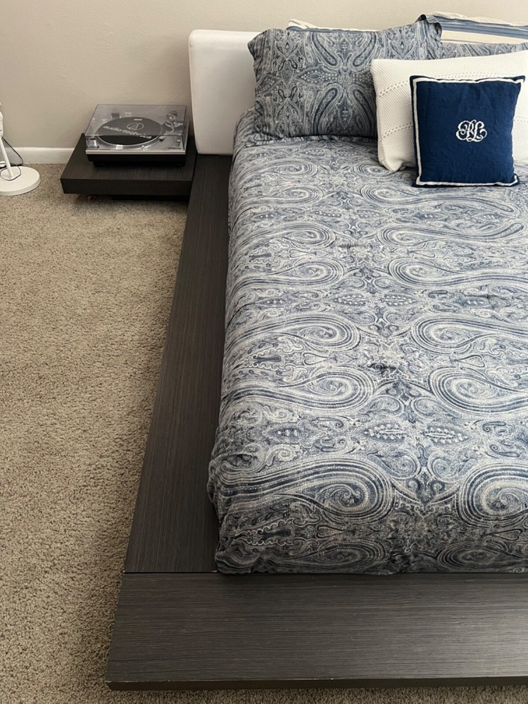 Transform your bedroom décor with this stylish platform bed frame from Joss & Main. Crafted from durable wood material with a sleek wood-effect finish, this queen-sized bed frame boasts a striking rectangular shape with a luxurious white leather upholstery fabric. It comes with two built-in nightstands to keep your essentials within reach, and all hardware and tools needed for assembly are included. This modern-style bed frame is the perfect addition to any bedroom, giving it a chic and sophisticated look. The bed frame is easy to care for, requiring only a damp cloth for cleaning for the bed frame and leather cleaner for the headboard. Assembly is required, but with the included hardware and tools, it will be a simple task by only bolts screws and an Allen wrench. Elevate your bedroom with this stunning platform bed frame from Joss & Main. When puchased knew it was $1,176.31 but I am listing it $700.00 for basically half. All sells are final and is listed as is.
