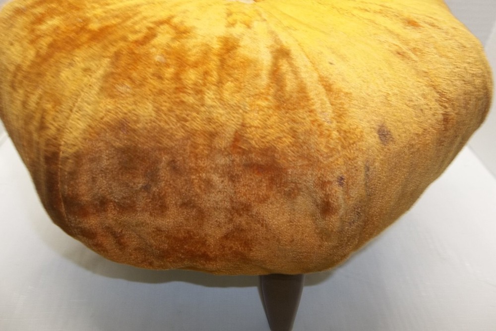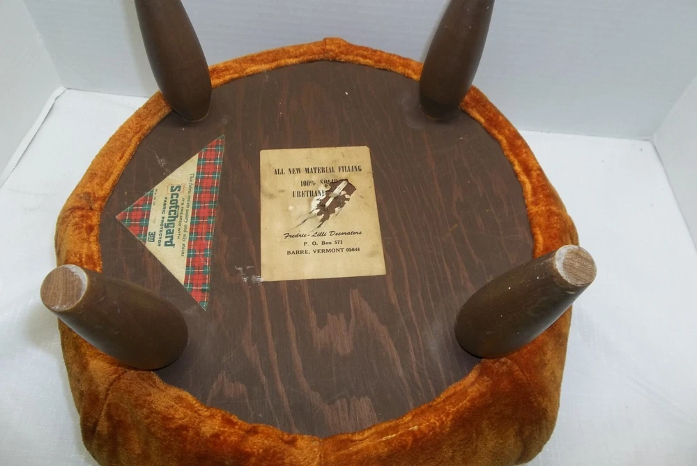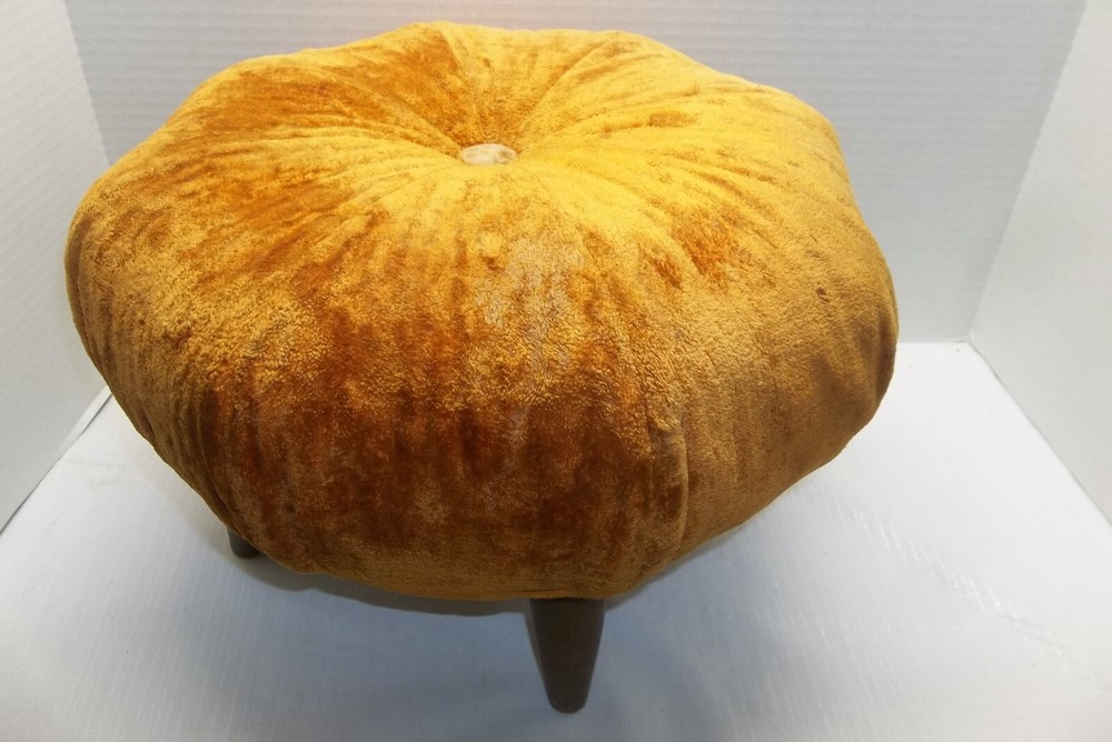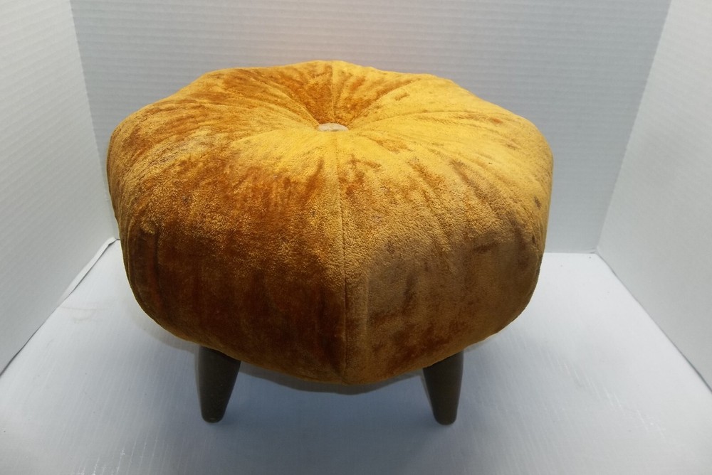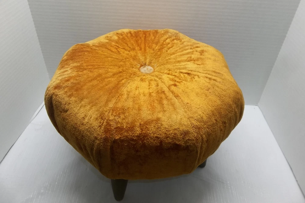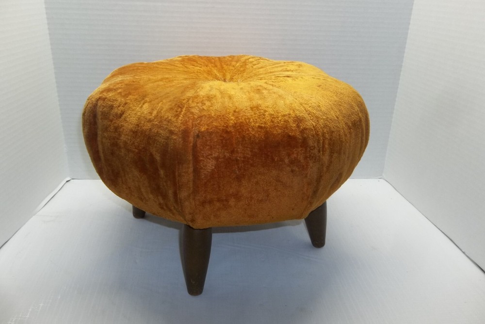 Add a pop of color to your living space with this vintage mid-century modern footrest. Made in the United States during the 1960s, this orange velour footrest is a unique addition to any collection. Its design is both stylish and functional, providing a comfortable place to rest your feet while adding a touch of retro charm to your home decor. Crafted with high-quality materials, this footrest is perfect for those who appreciate vintage collectibles. It is not handmade and is categorized under 1960s, vintage, retro, and mid-century modern collectibles. The object type is a foot stool, and it is a great piece for anyone looking to add a touch of nostalgia to their living space. This is an awesome stool, but it has some pile loss in spots and especially on the center button as shown it pictures, it is being sold for restoration, but a good cleaning may rejuvenate the pile some. 12" wide 10" tall