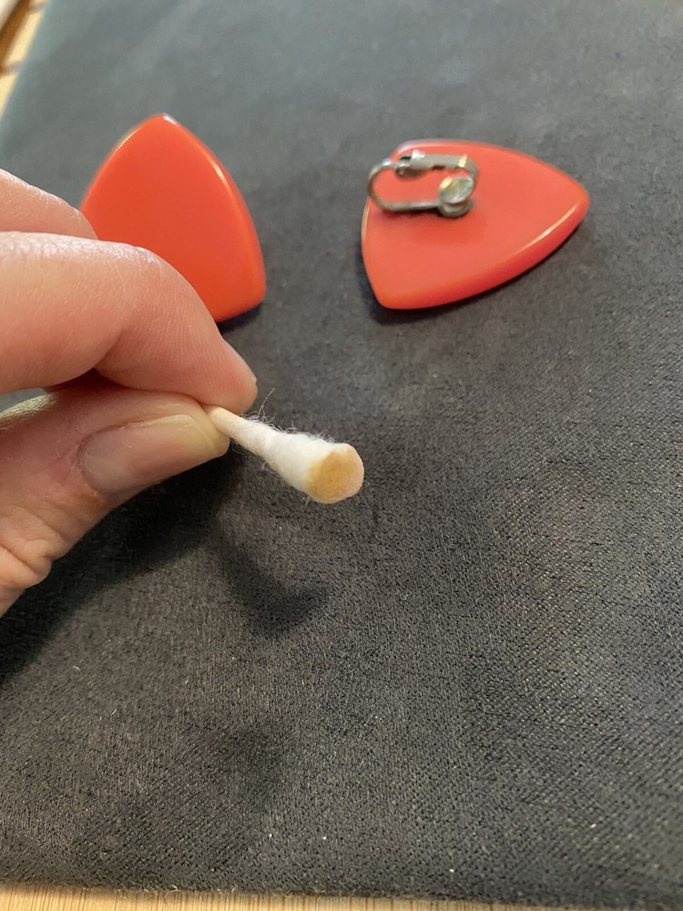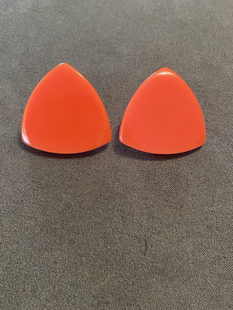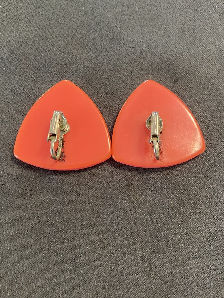 vintage orange triangle Bakelite mid century clip on earrings. These are preowned earrings that show normal signs of wear and age. I do not polish or clean items and leave that up to the buyer. These have been semichrone tested. Please view all photos before purchasing thank you.